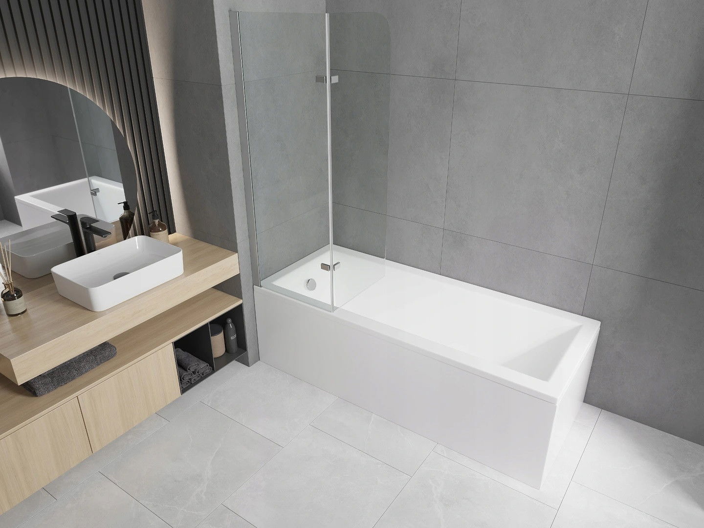 Paravent composé de deux battants pouvant être repliés. Cette solution permet d'économiser plus d'espace dans la salle de bain et de profiter librement du reste de l'espace lorsque nous n'utilisons pas la zone de bain.