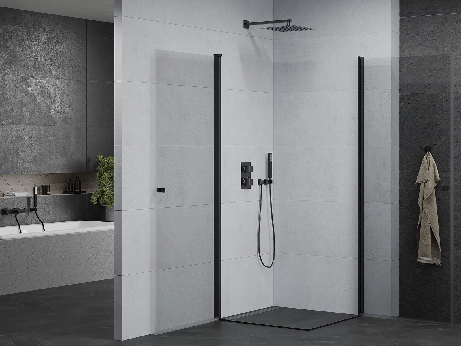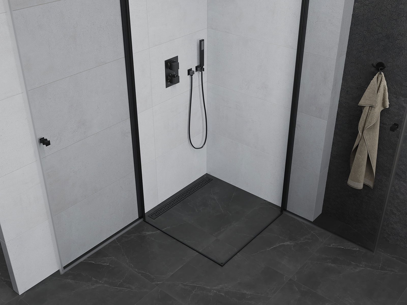 La poignée pratique et confortable est fabriquée en métal durable et résistant. Sa forme à la mode, combinée à une finition assortie à la couleur des profilés, donne à l'ensemble un aspect moderne et stylé, soulignant l'esthétique de chaque salle de bain.