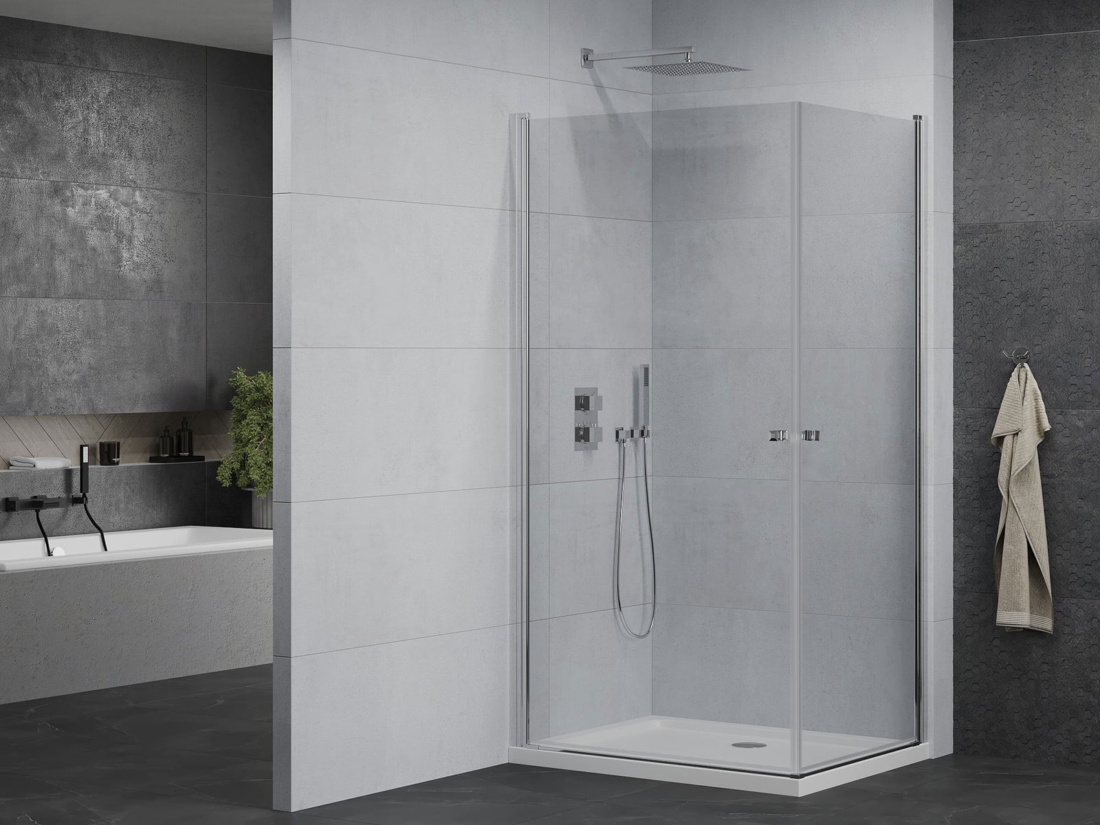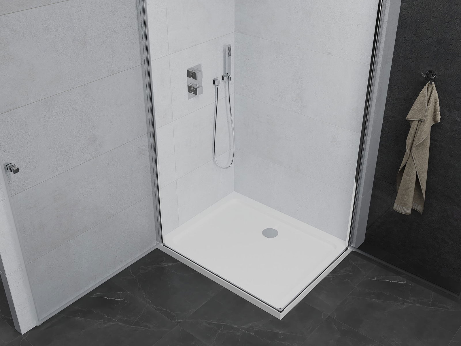 La poignée pratique et confortable est fabriquée en métal durable et résistant. Sa forme à la mode, combinée à une finition assortie à la couleur des profilés, donne à l'ensemble un aspect moderne et stylé, soulignant l'esthétique de chaque salle de bain.