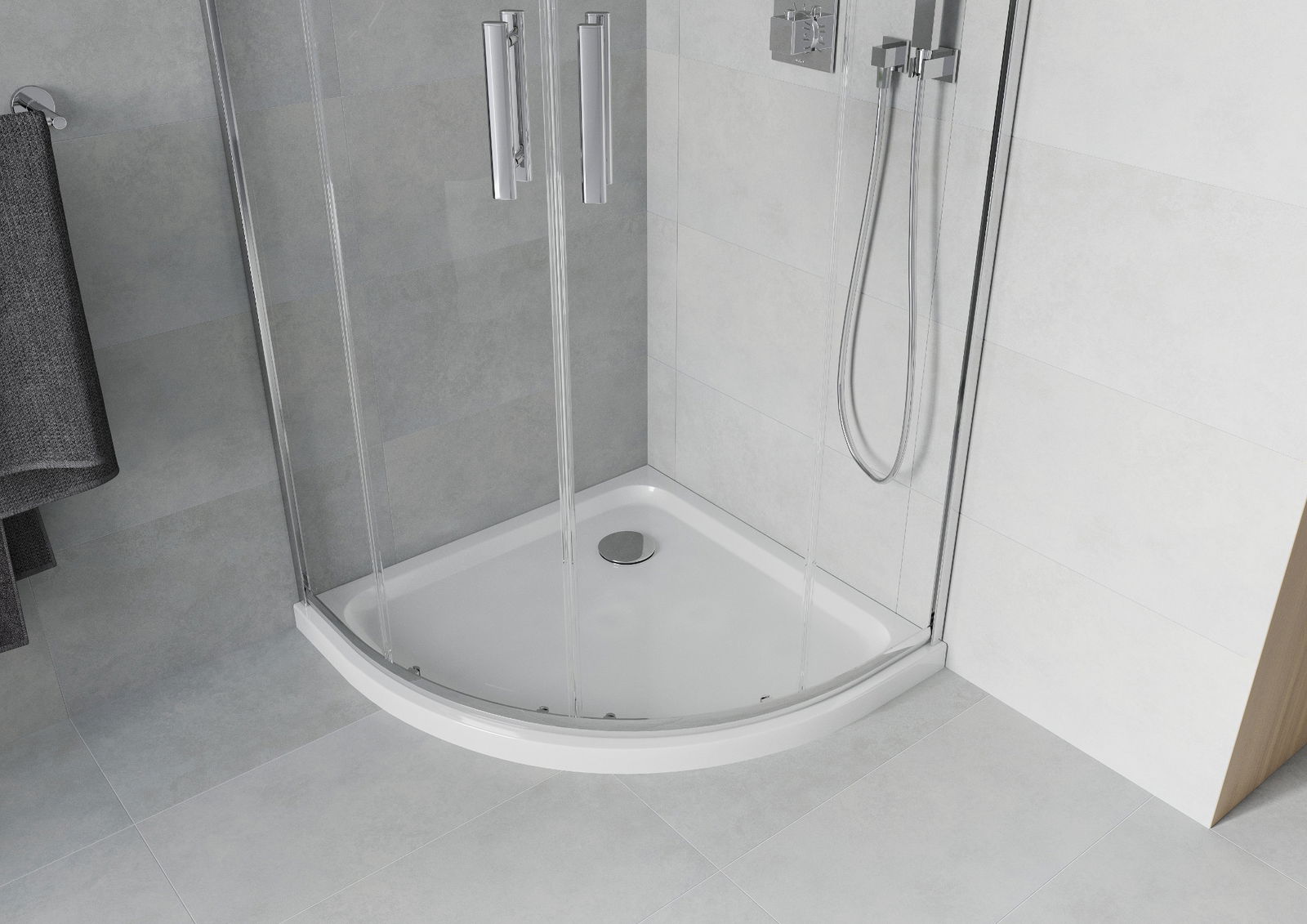 La poignée pratique et confortable est fabriquée en métal durable et résistant. Sa forme élégante, associée à une finition assortie à la couleur des profilés, confère à l'ensemble un style moderne et élégant, soulignant l'esthétique de chaque salle de bains.