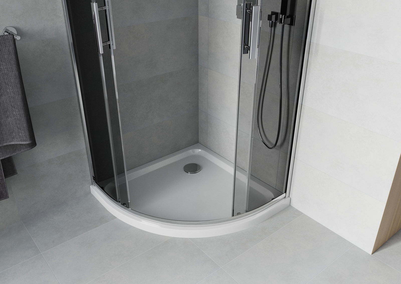 La poignée pratique et confortable est fabriquée en métal durable et résistant. Sa forme à la mode, combinée à une finition assortie à la couleur des profilés, donne à l'ensemble un aspect moderne et stylé, soulignant l'esthétique de chaque salle de bain.