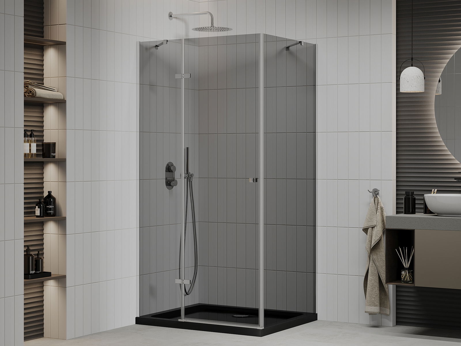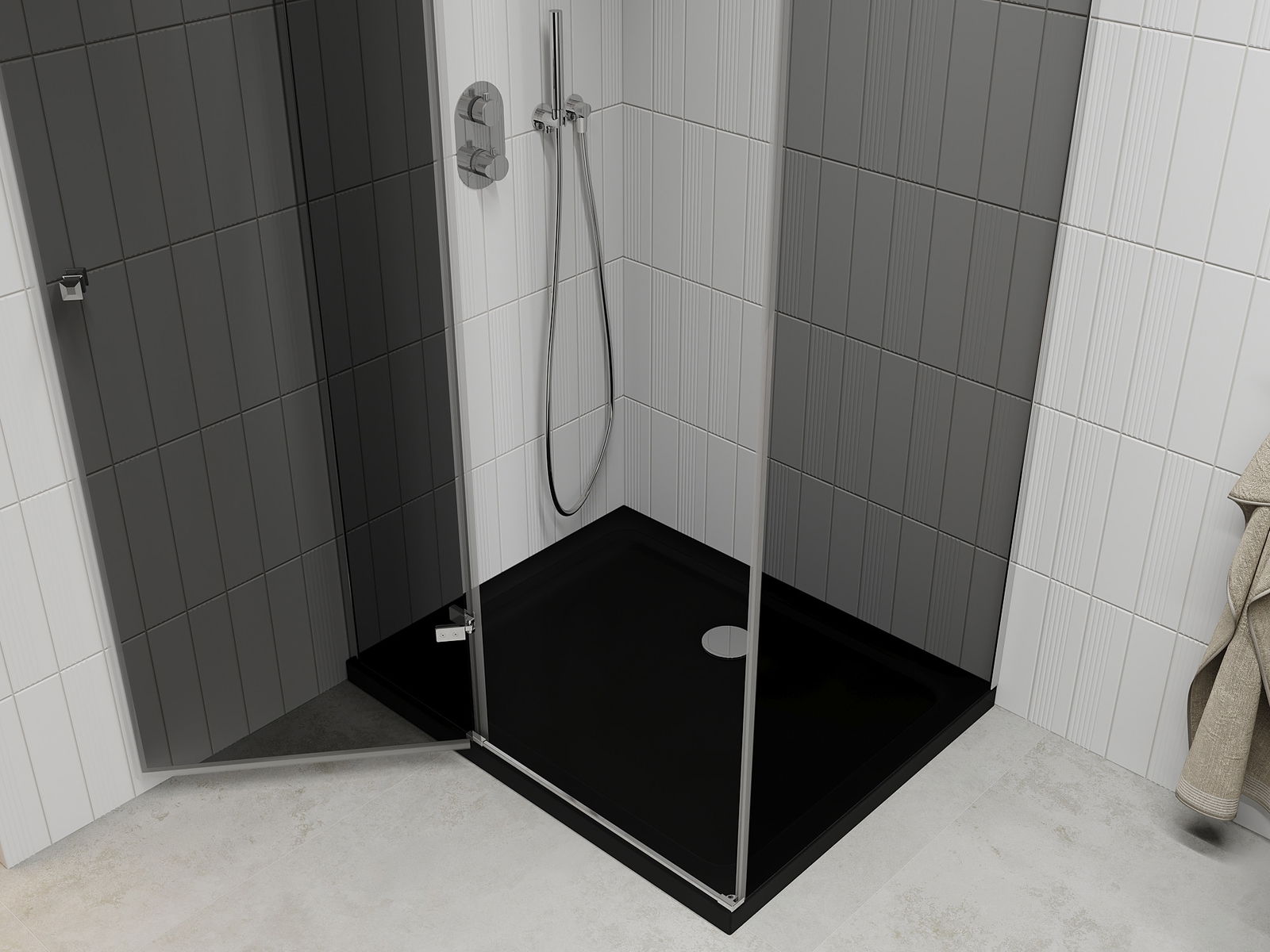 La poignée pratique et confortable est fabriquée en métal durable et résistant. Sa forme à la mode, combinée à une finition assortie à la couleur des profilés, donne à l'ensemble un aspect moderne et stylé, soulignant l'esthétique de chaque salle de bain.