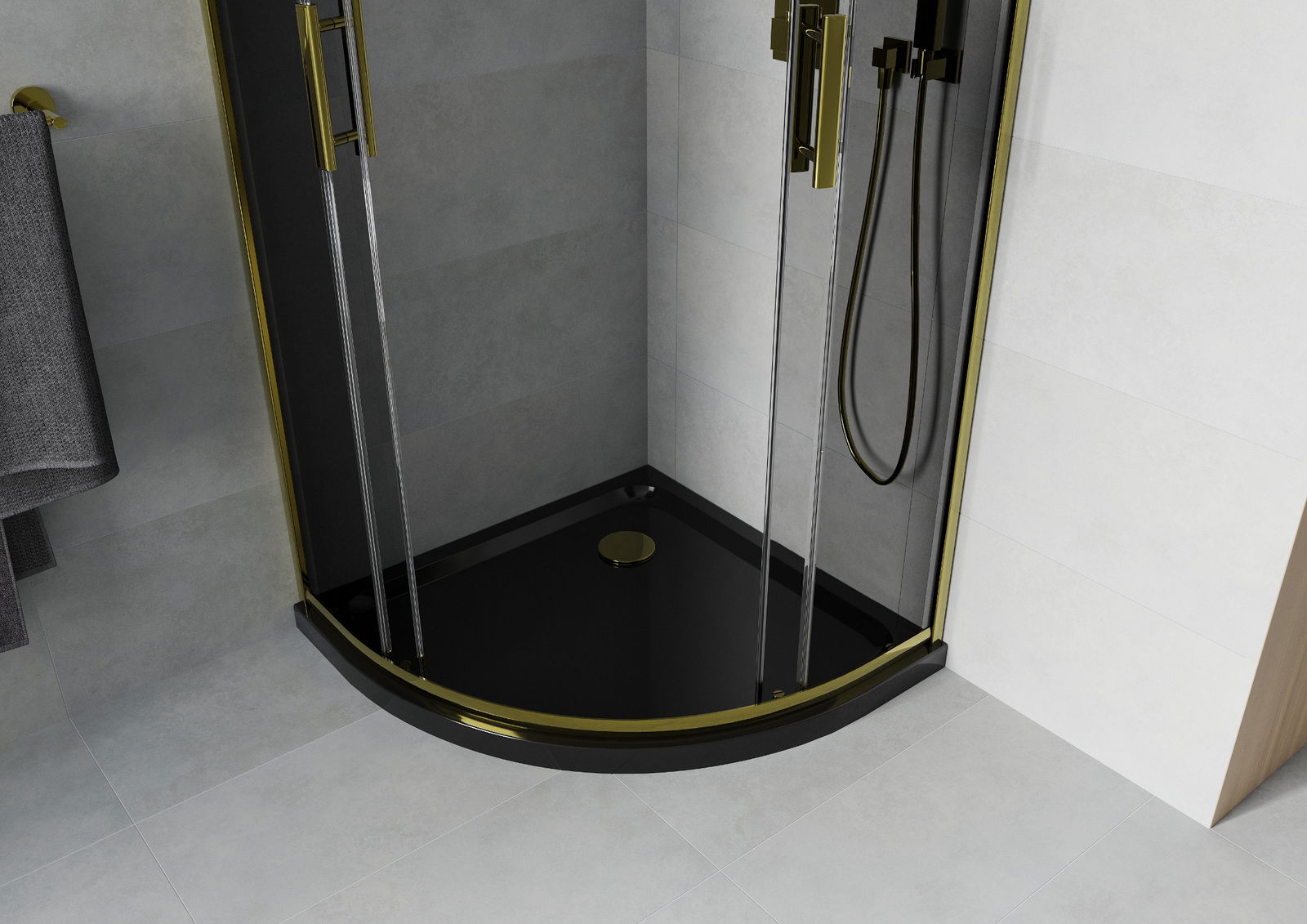 Mexen Rio cabine de douche en quart de cercle 90 x 90 cm, graphite, or + receveur Flat, noir - 863-090-090-50-40-4170G