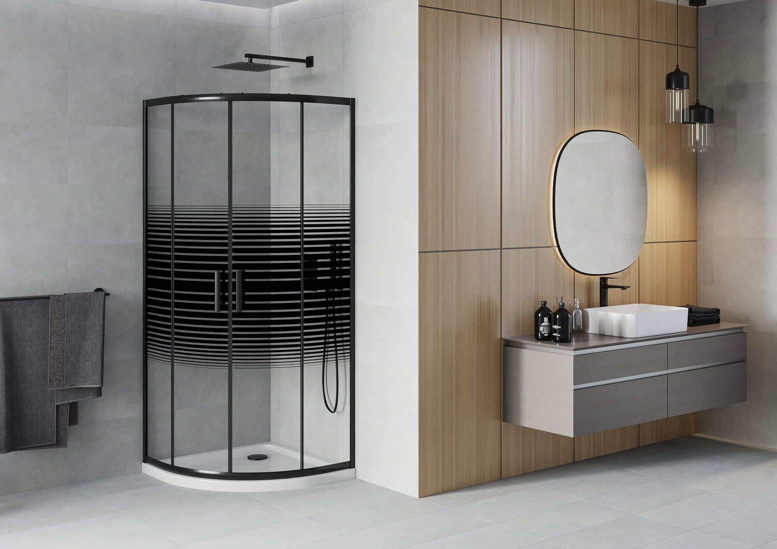 La poignée pratique et confortable est fabriquée en métal durable et résistant. Sa forme élégante, associée à une finition assortie à la couleur des profilés, confère à l'ensemble un style moderne et élégant, soulignant l'esthétique de chaque salle de bains.