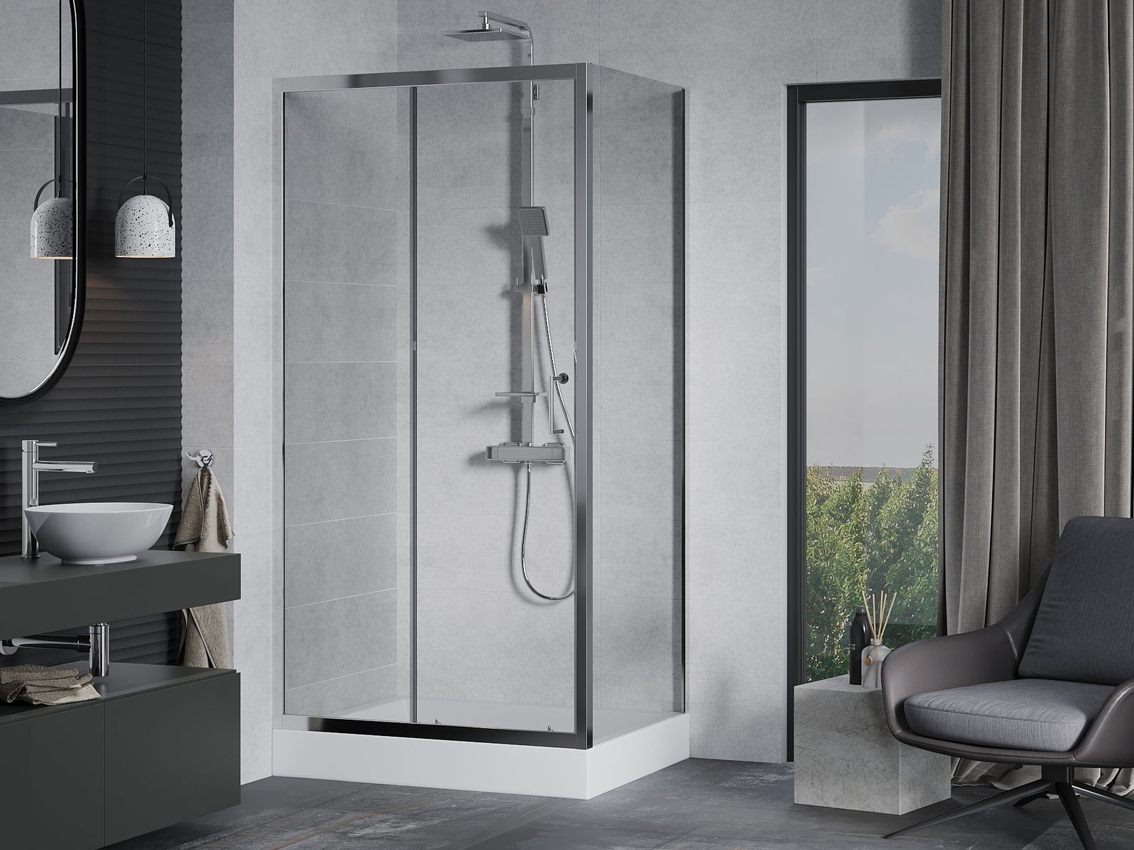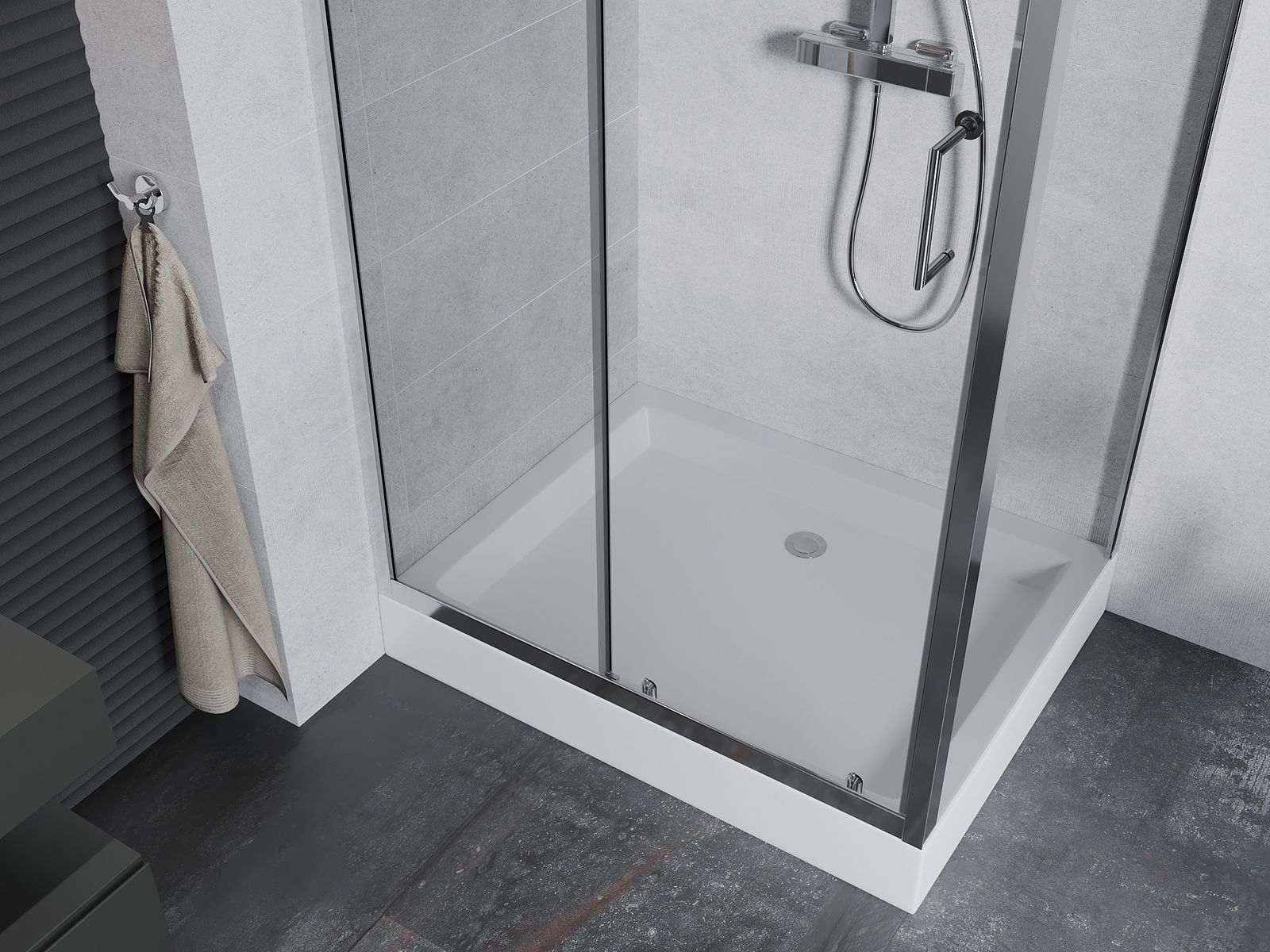 La poignée pratique et confortable est fabriquée en métal durable et résistant. Sa forme à la mode, combinée à une finition assortie à la couleur des profilés, donne à l'ensemble un aspect moderne et stylé, soulignant l'esthétique de chaque salle de bain.