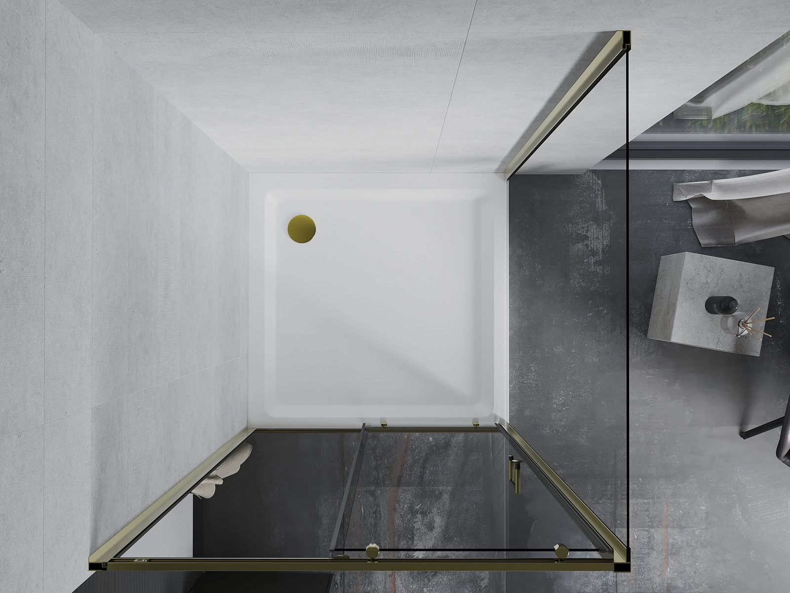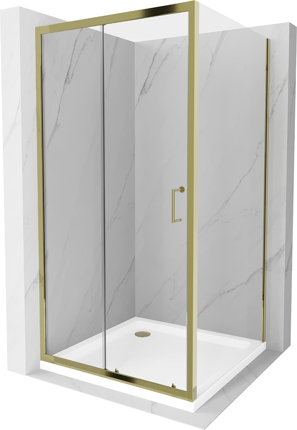 Mexen Apia cabine de douche coulissante 100 x 100 cm, transparent, dorée + receveur Flat, blanc- 840-100-100-50-00-4010G