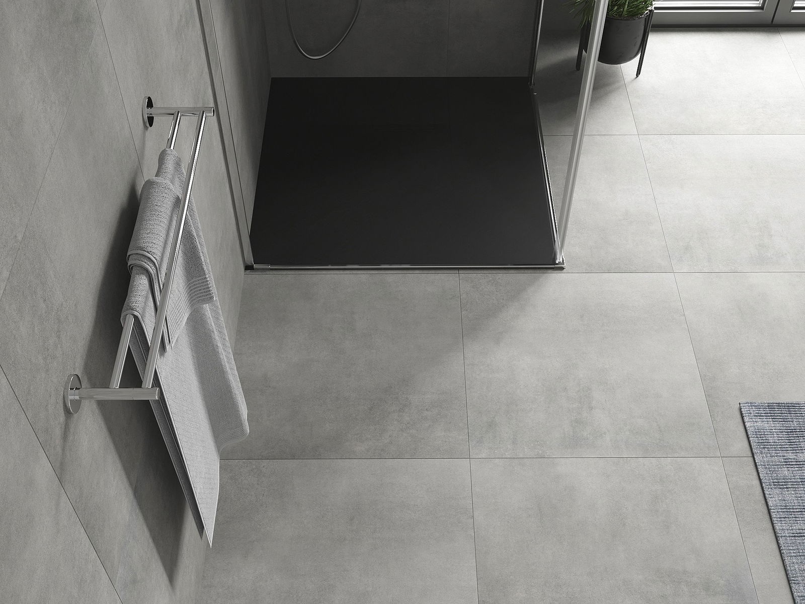 La surface du receveur de douche évoque la pierre. C'est une combinaison unique d'aspect naturel et de design intérieur moderne. Il ajoute du caractère, souligne l'esthétique et l'élégance de la salle de bains et séduit par sa forme.