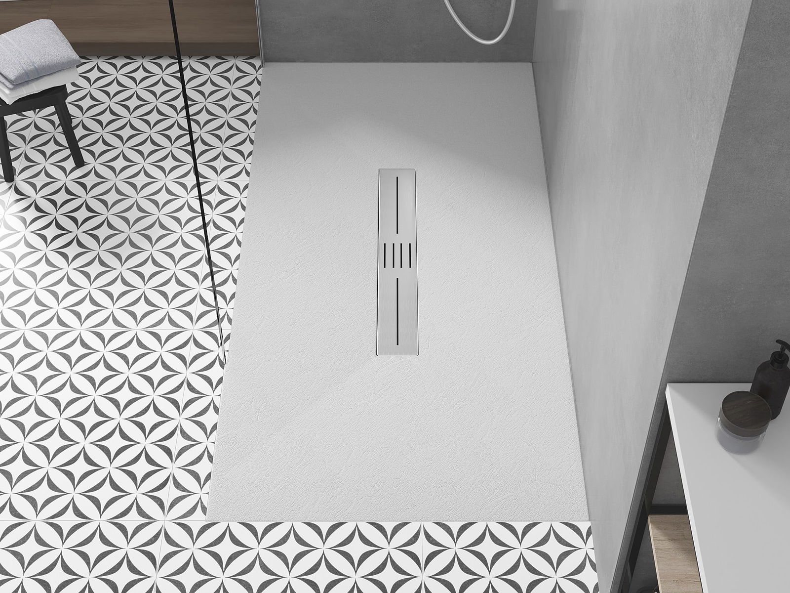 La surface du receveur de douche rappelle par sa structure la pierre. Elle constitue une combinaison exceptionnelle d'un aspect naturel et d'un aménagement intérieur moderne. Elle ajoute du caractère, souligne l'esthétique et l'élégance de la décoration de la salle de bains et séduit par sa forme.