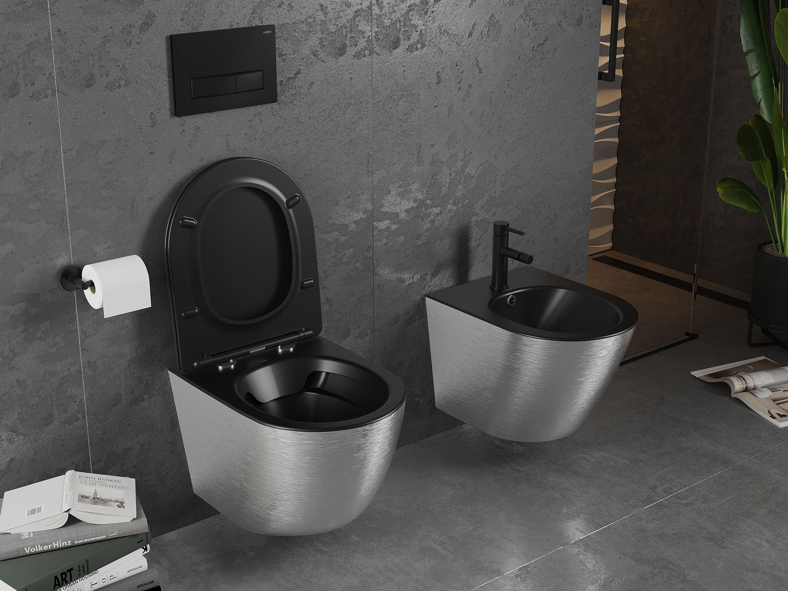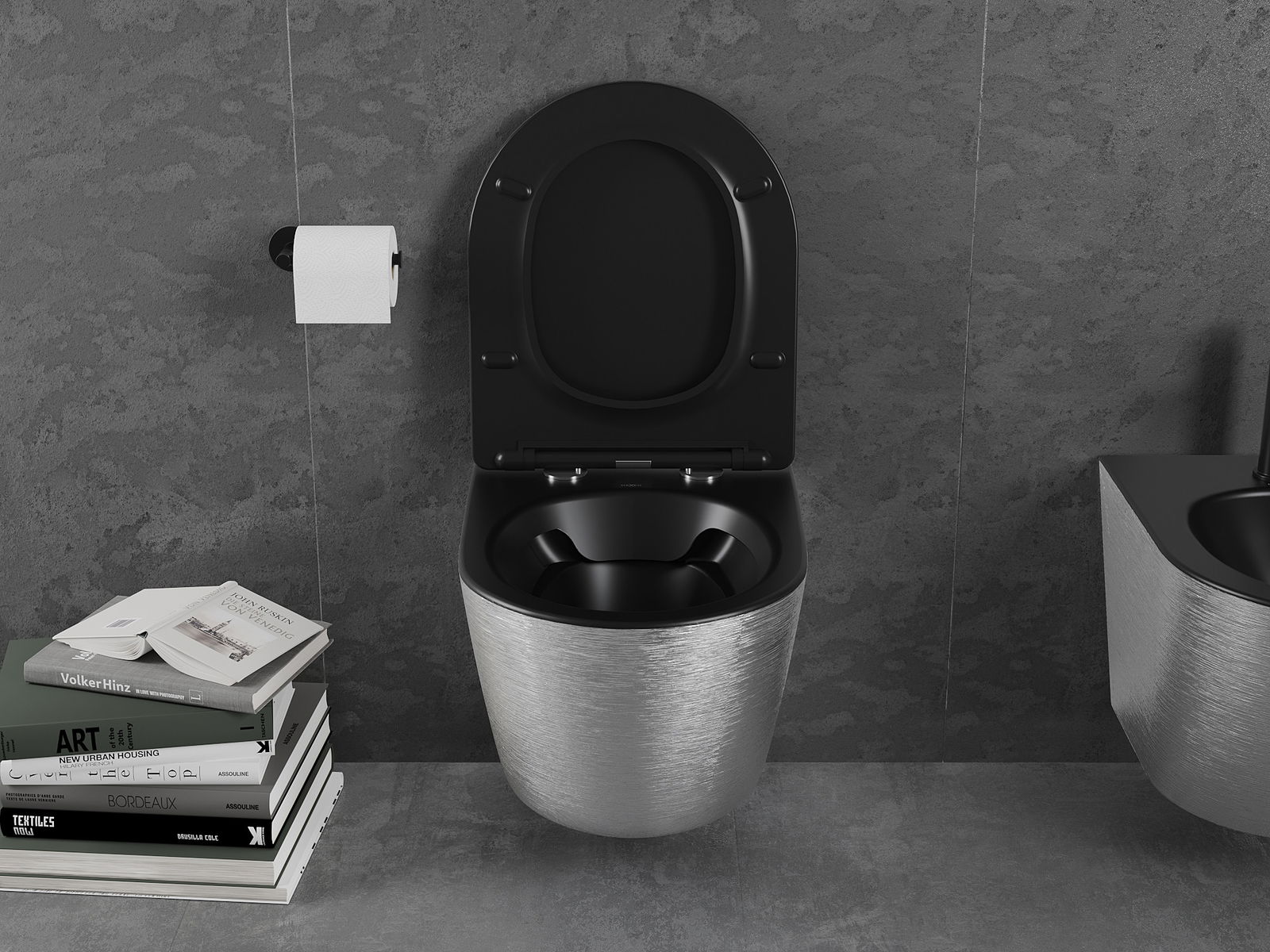 Mexen Lena cuvette WC sans rebord avec abattant à descente lente slim, duroplast, noir mat/motif lignes argent - 30224073