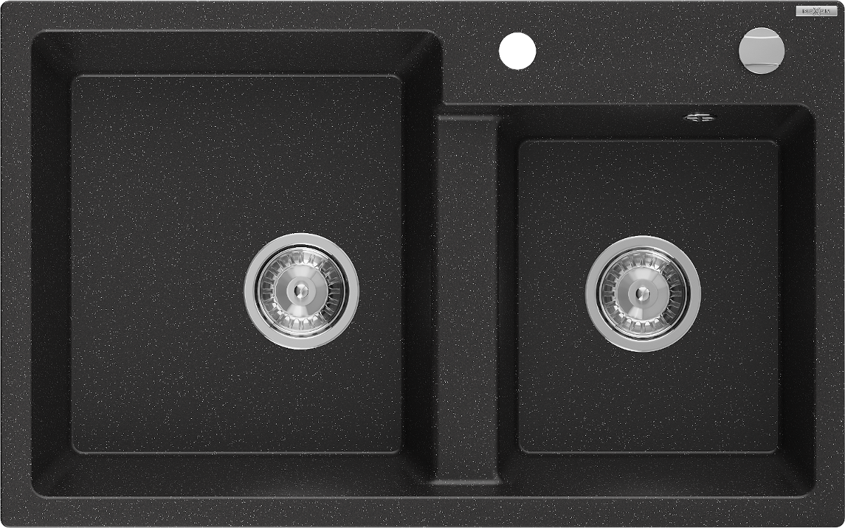 Mexen Tomas évier en granit à 2 cuves 800 x 500 mm, noir/métallique argenté, siphon chromé - 6516802000-73
