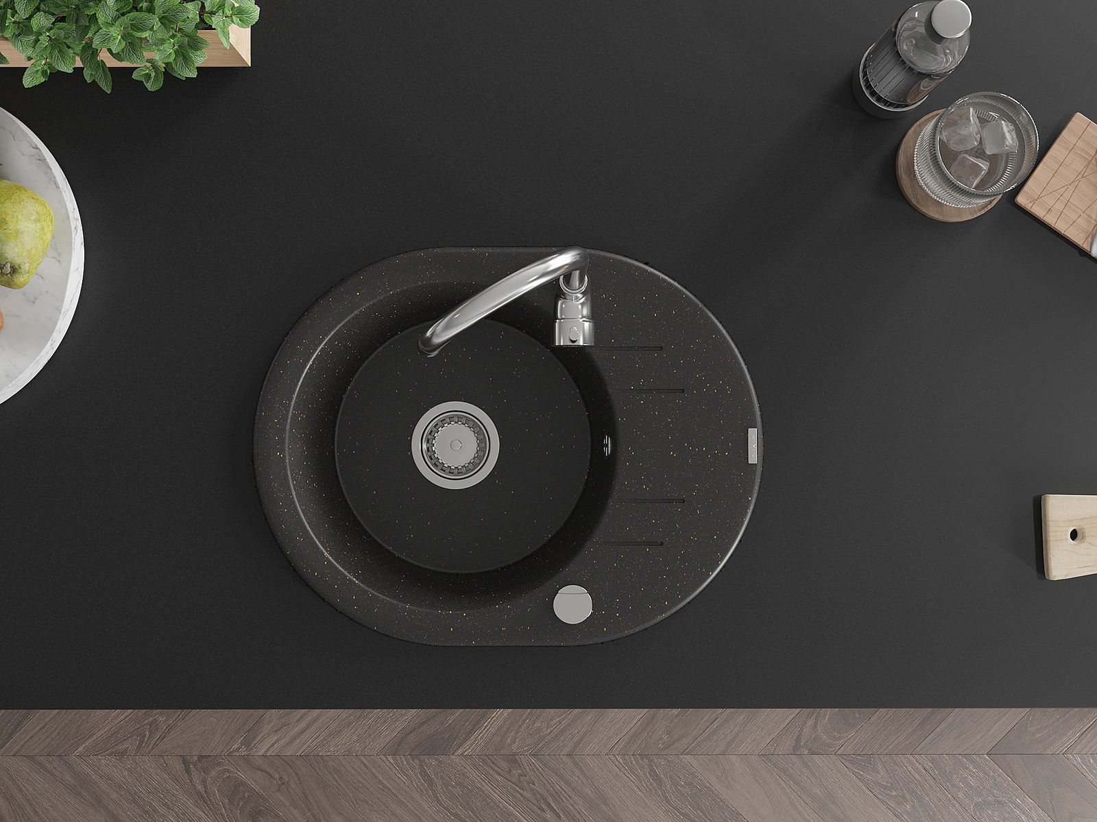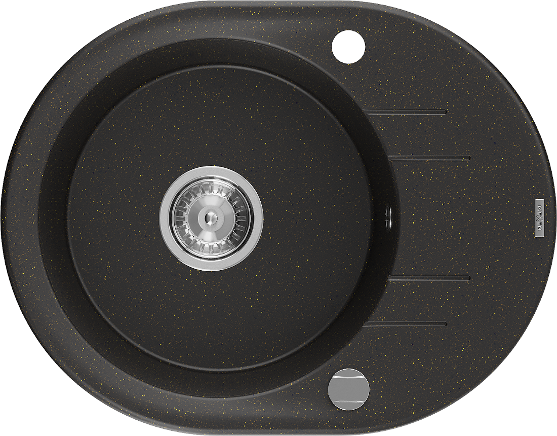 Mexen Kevin évier en granit 1 bac avec égouttoir 586 x 458 mm, noir/or métallique, siphon chromé - 6517581005-75