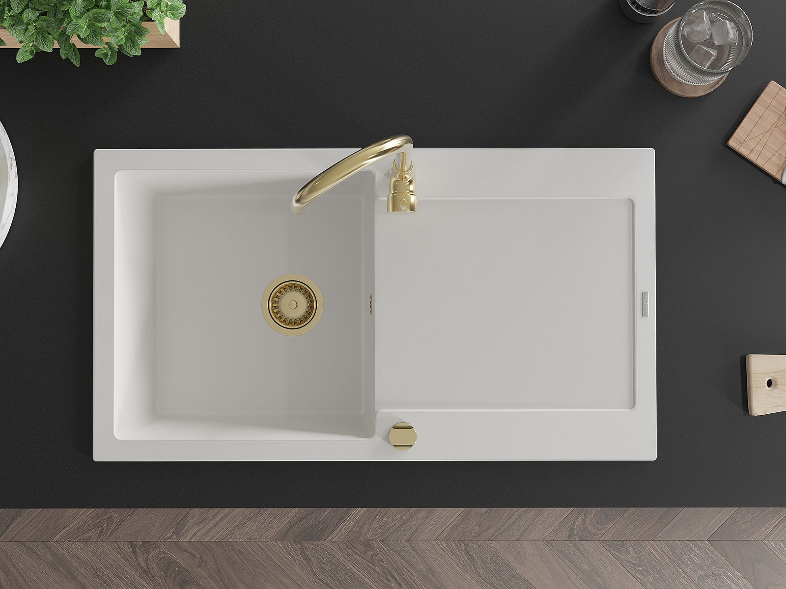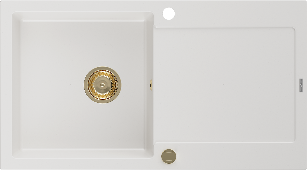 Mexen Leo évier en granit 1 bac avec égouttoir 900 x 500 mm, blanc, siphon doré - 6501901010-20-G