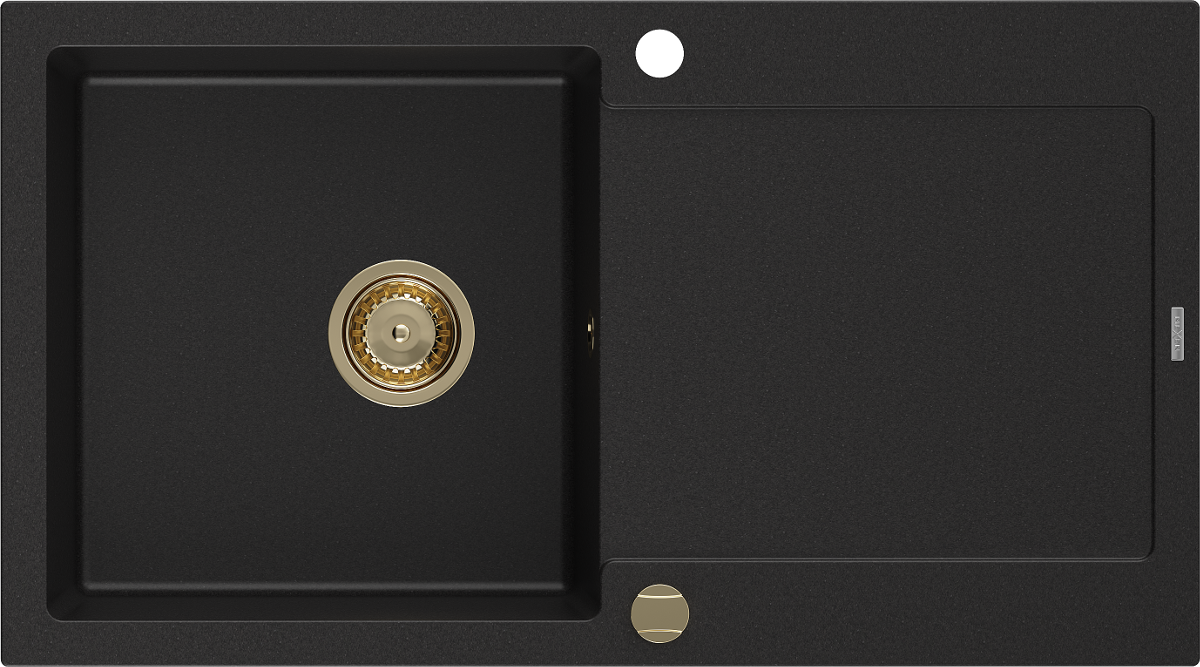 Mexen Leo évier de cuisine en granit à 1 bac avec égouttoir 900 x 500 mm, noir, siphon doré - 6501901010-77-G