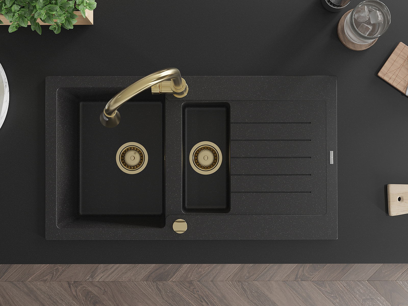 Mexen Matias évier en granit 1,5 bac avec égouttoir 900 x 505 mm, noir/argent métallique, siphon doré - 6502901505-73-G