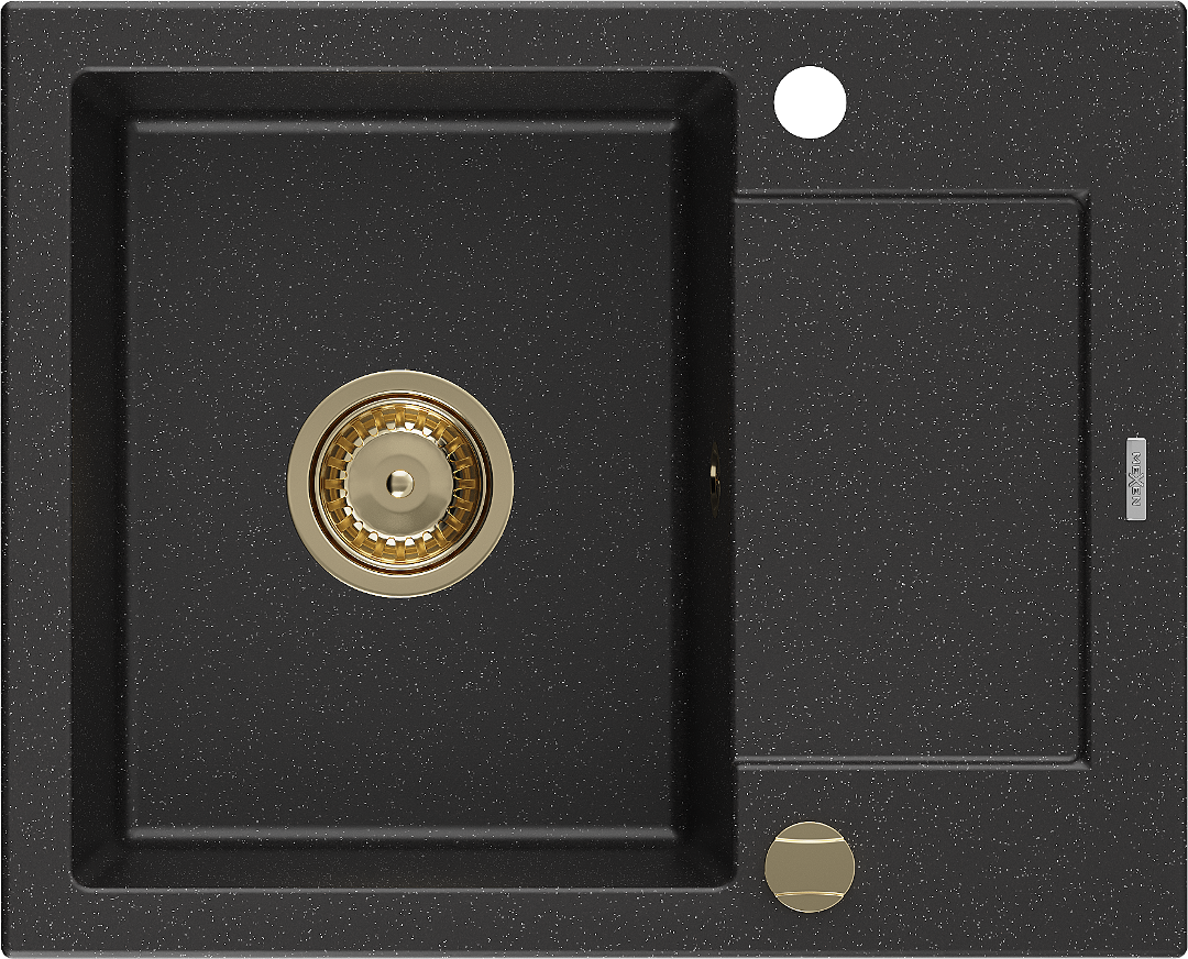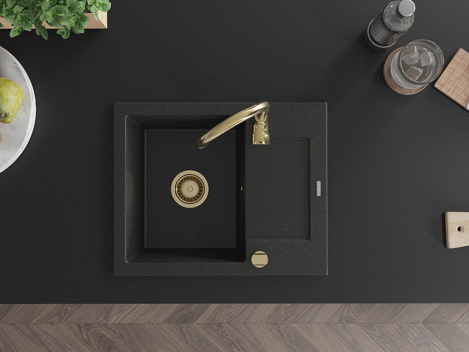 Mexen Enzo évier en granit 1 bac avec égouttoir 576 x 465 mm, noir/argent métallisé, siphon doré - 6506571005-73-G
