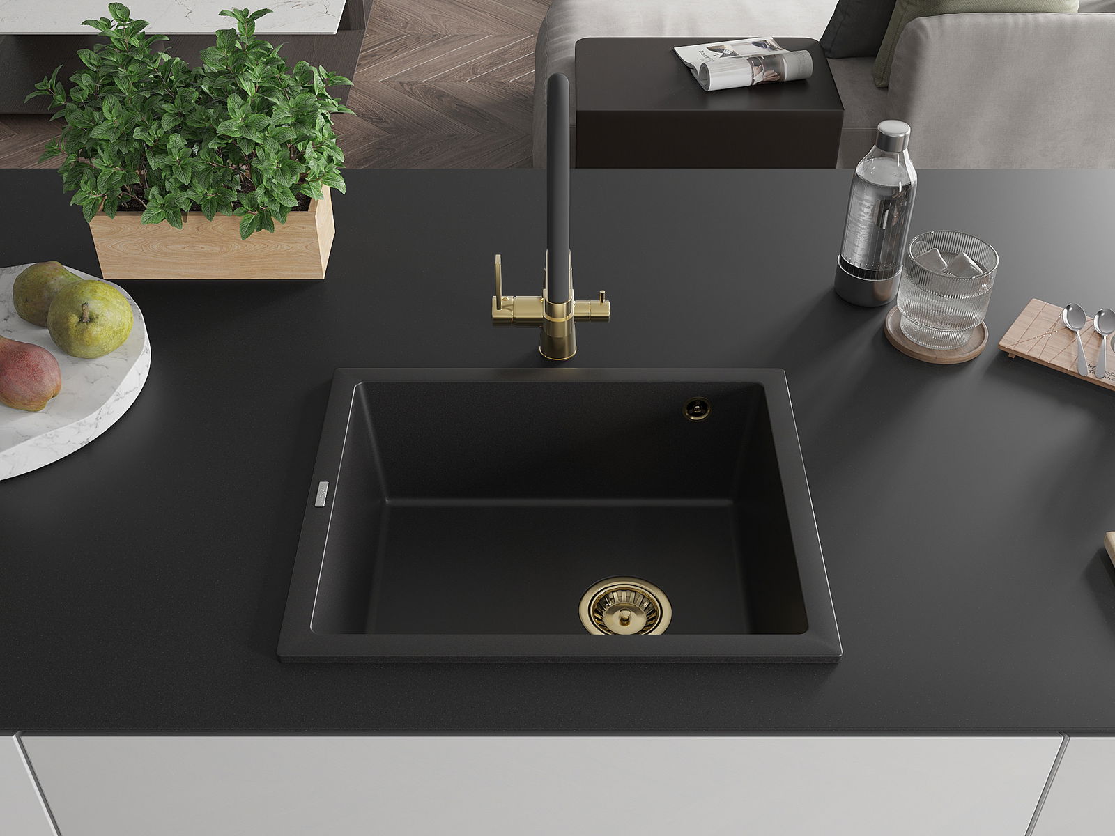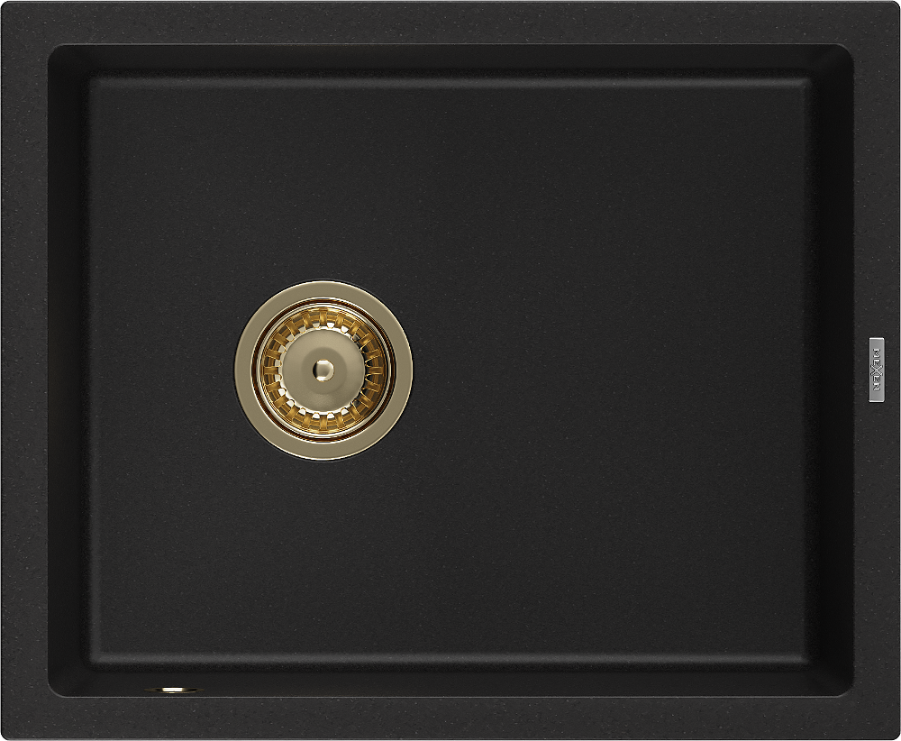 Mexen Pedro évier en granit 1 bac 560 x 460 mm, noir, siphon doré - 6508561000-77-G