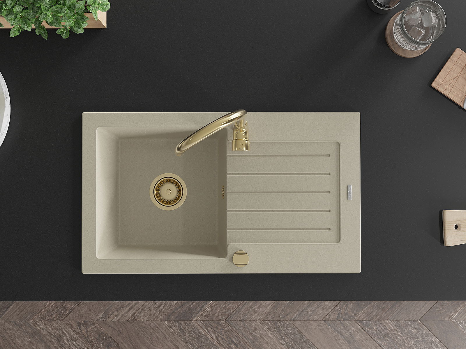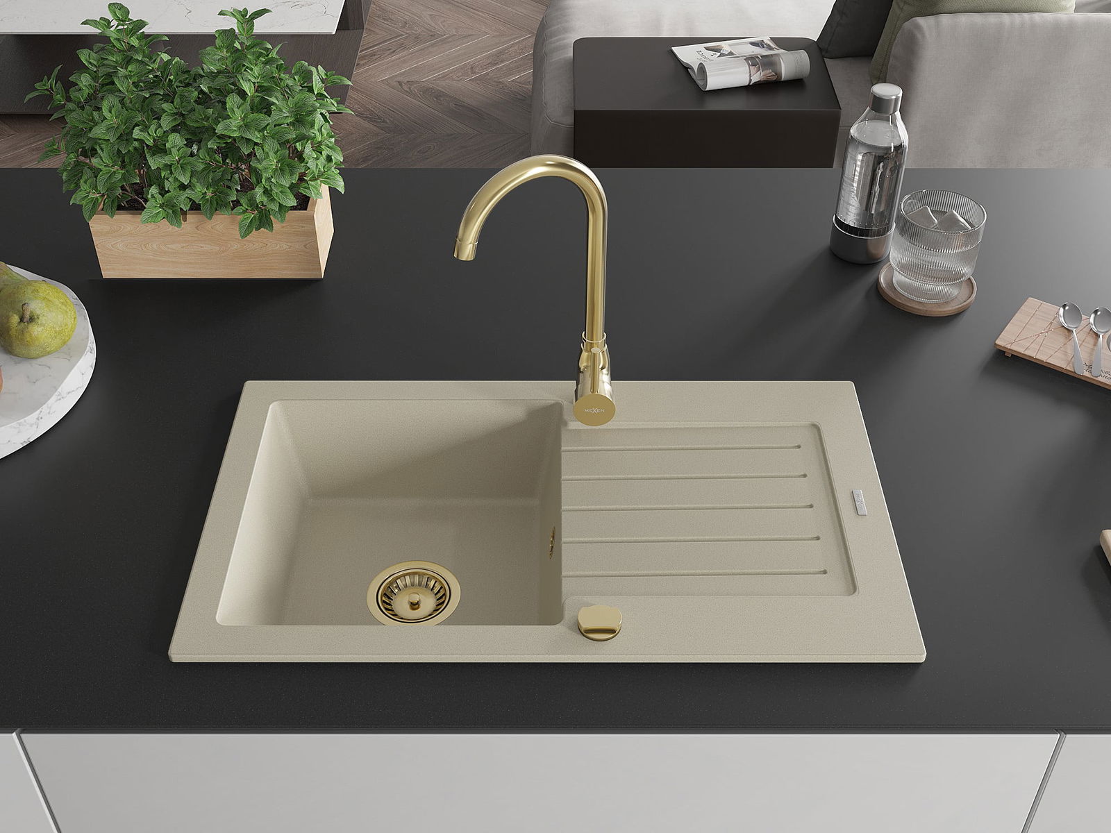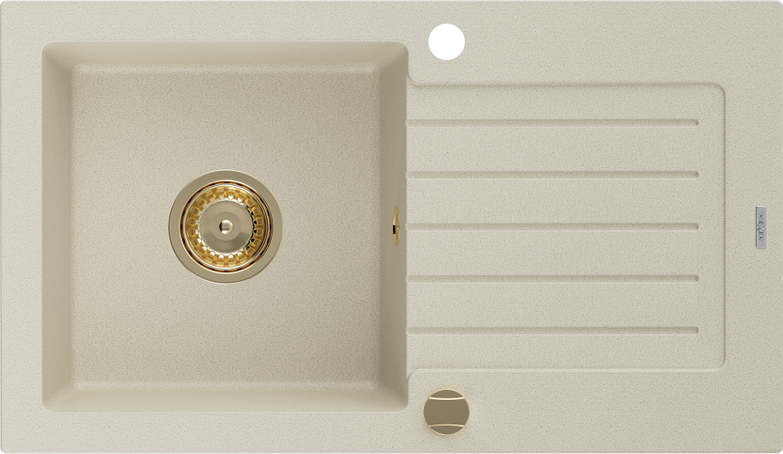 Mexen Pablo évier en granit 1 bac avec égouttoir 752 x 436 mm, beige, siphon doré - 6510751010-69-G