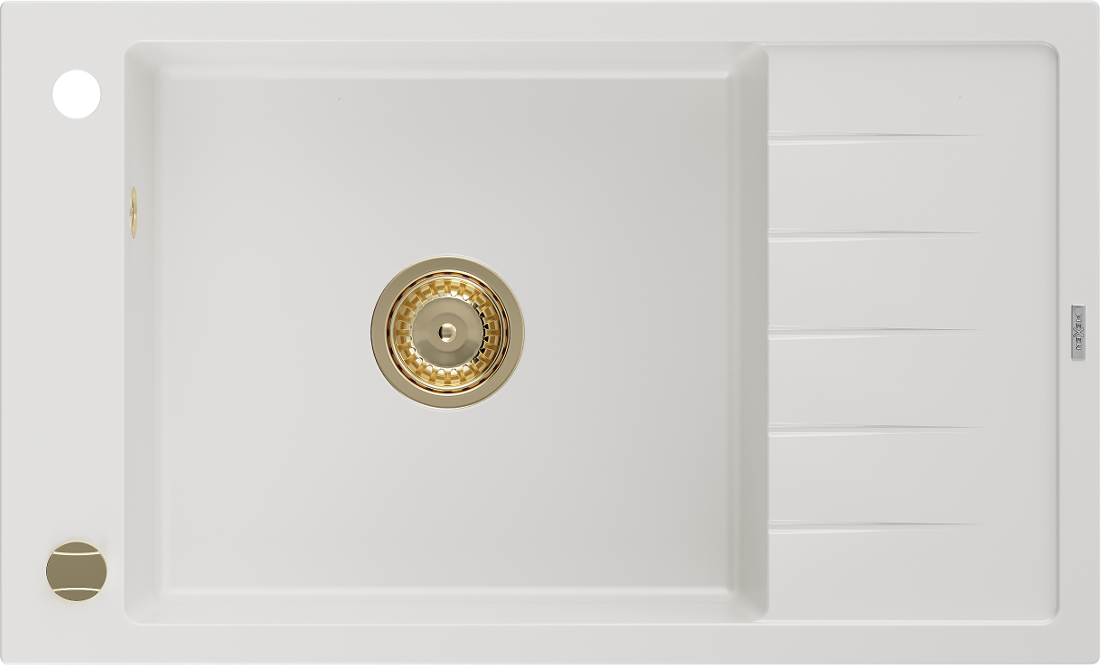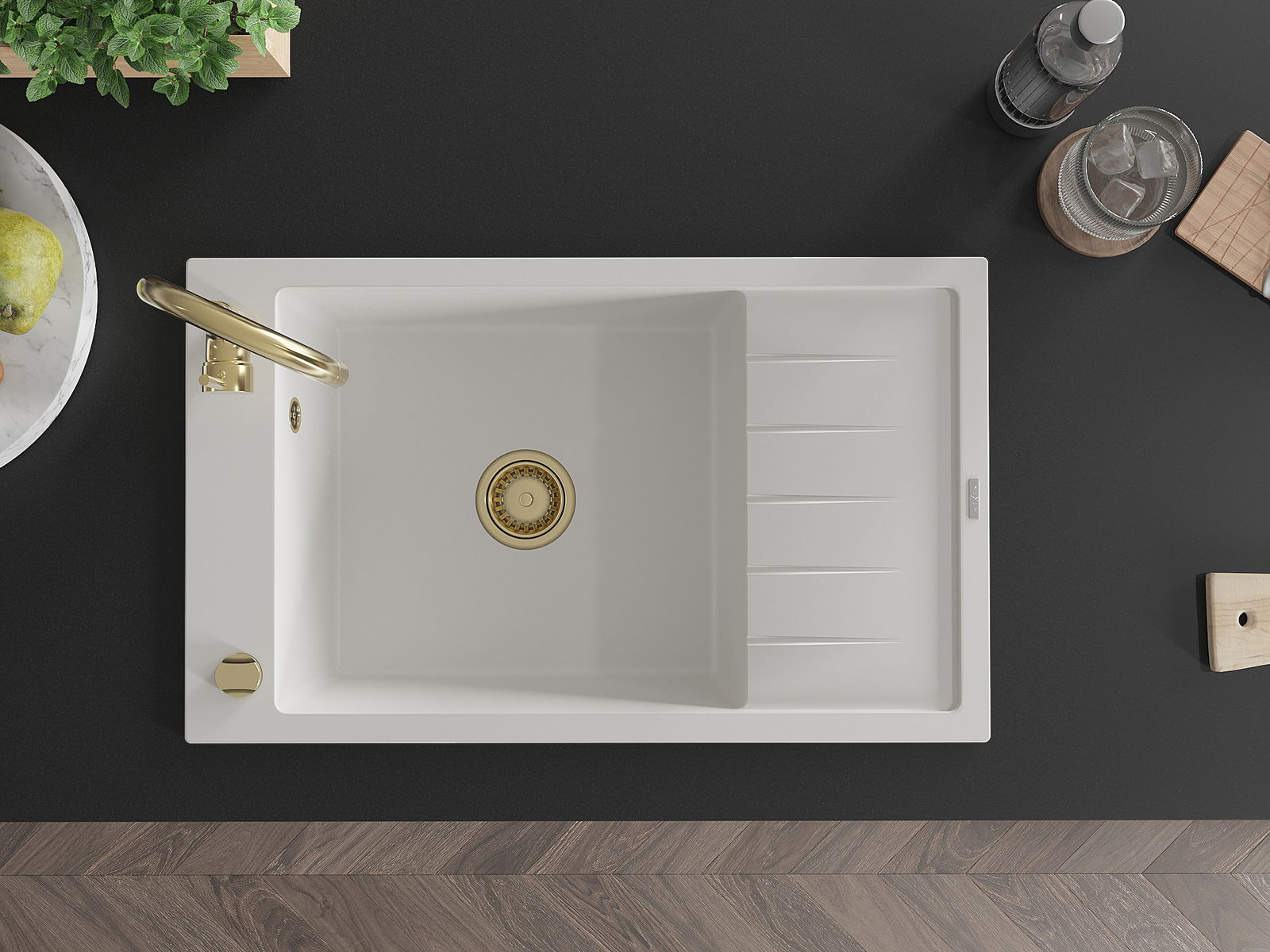 Mexen Elias évier en granit 1 bac avec égouttoir 795 x 480 mm, blanc, siphon doré - 6511791005-20-G