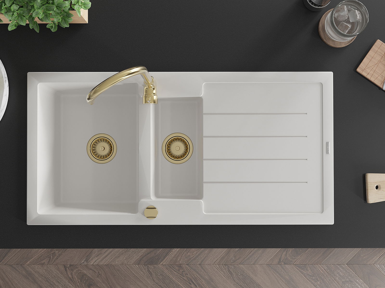 Mexen Andres évier en granit 1,5 bac avec égouttoir 1000 x 500 mm, blanc, siphon doré - 6515101510-20-G