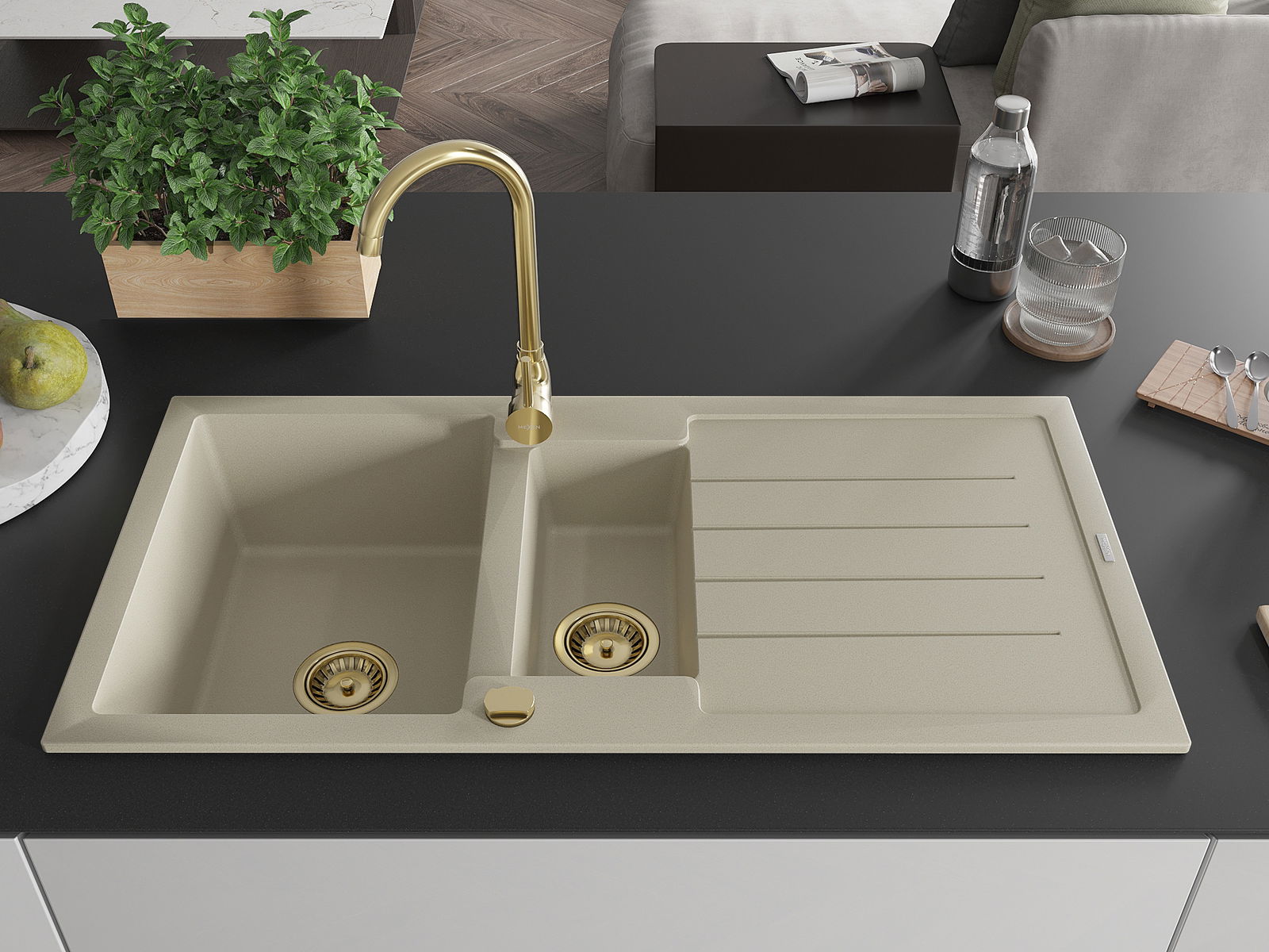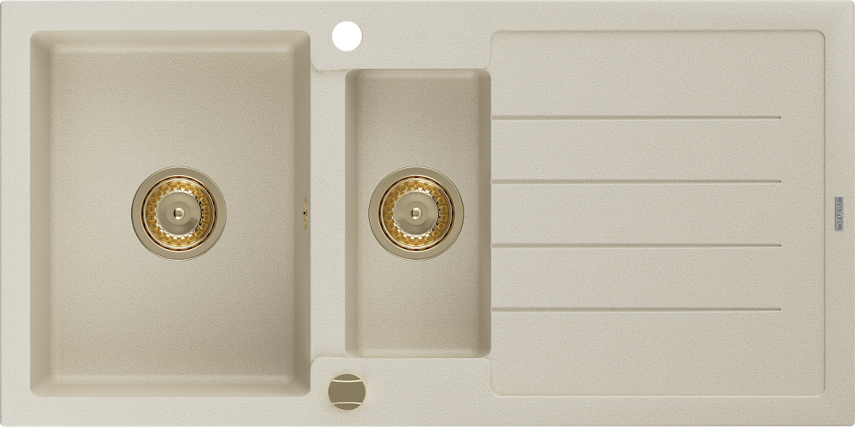 Mexen Andres évier en granit 1,5 bac avec égouttoir 1000 x 500 mm, beige, siphon doré - 6515101510-69-G