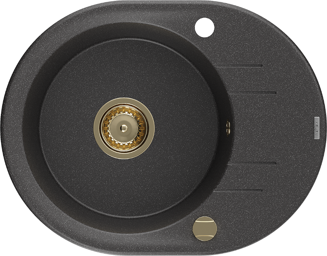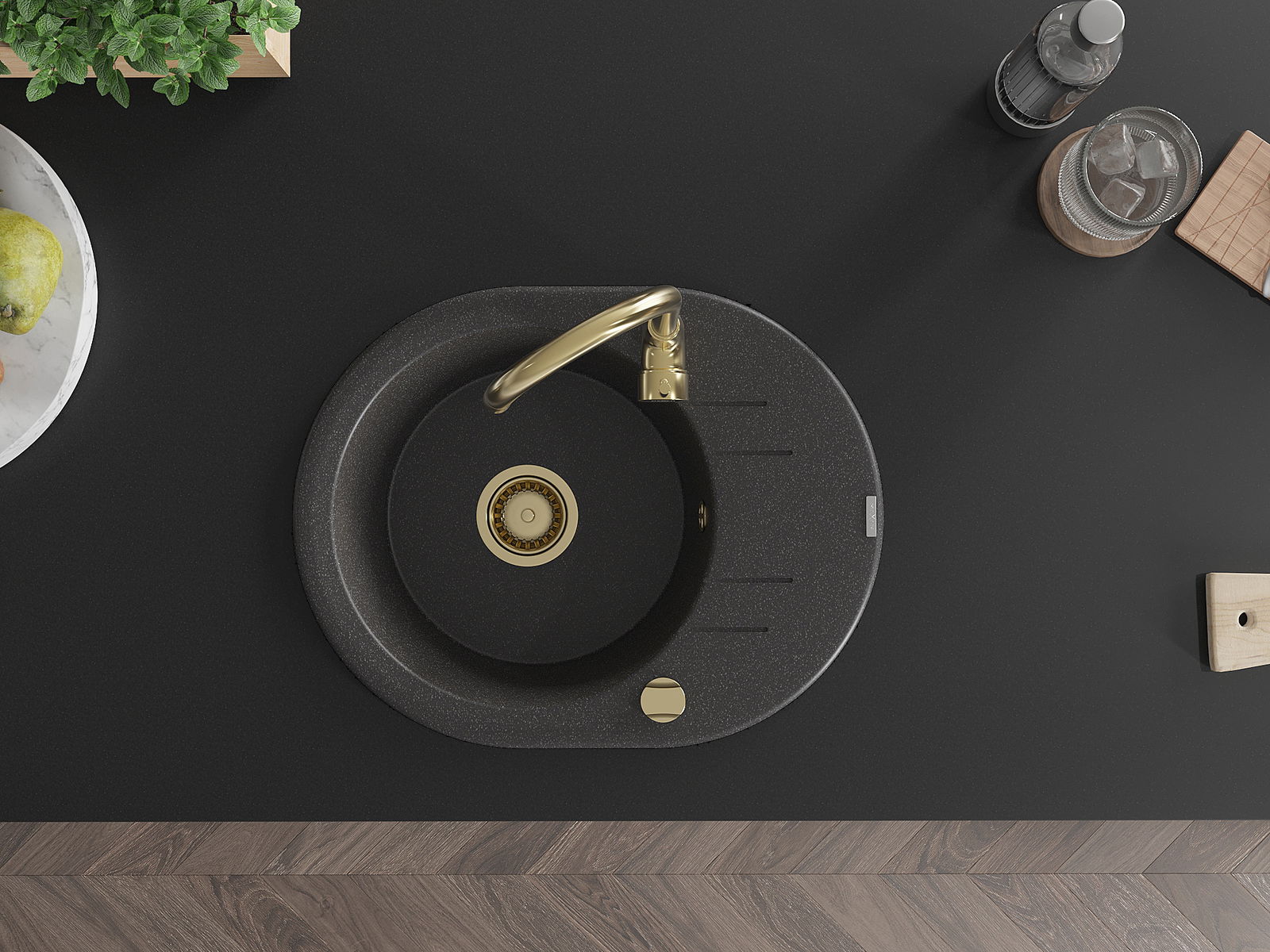 Mexen Kevin évier en granit à 1 bac avec égouttoir 586 x 458 mm, noir moucheté, siphon doré - 6517581005-76-G
