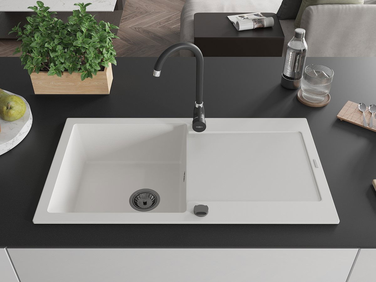 Mexen Leo évier en granit 1 bac avec égouttoir 900 x 500 mm, blanc, siphon noir - 6501901010-20-B