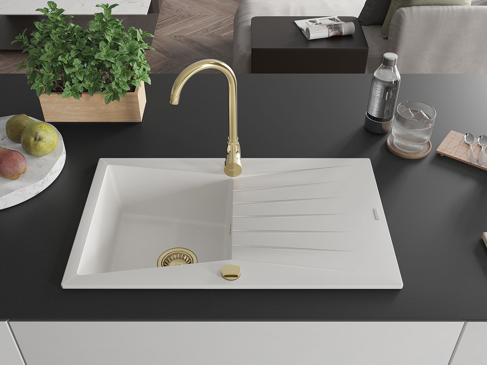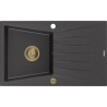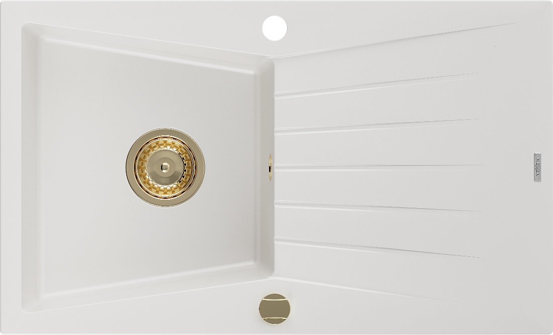 Mexen Cesar évier en granit 1 bac avec égouttoir 775 x 470 mm, blanc, siphon doré - 6514771010-20-G