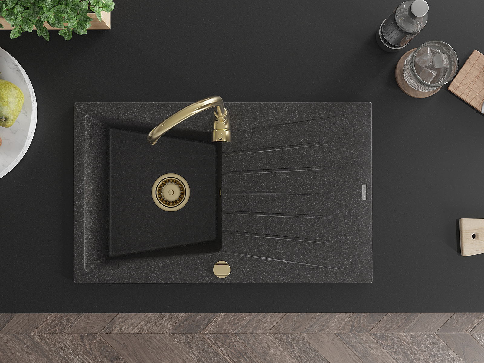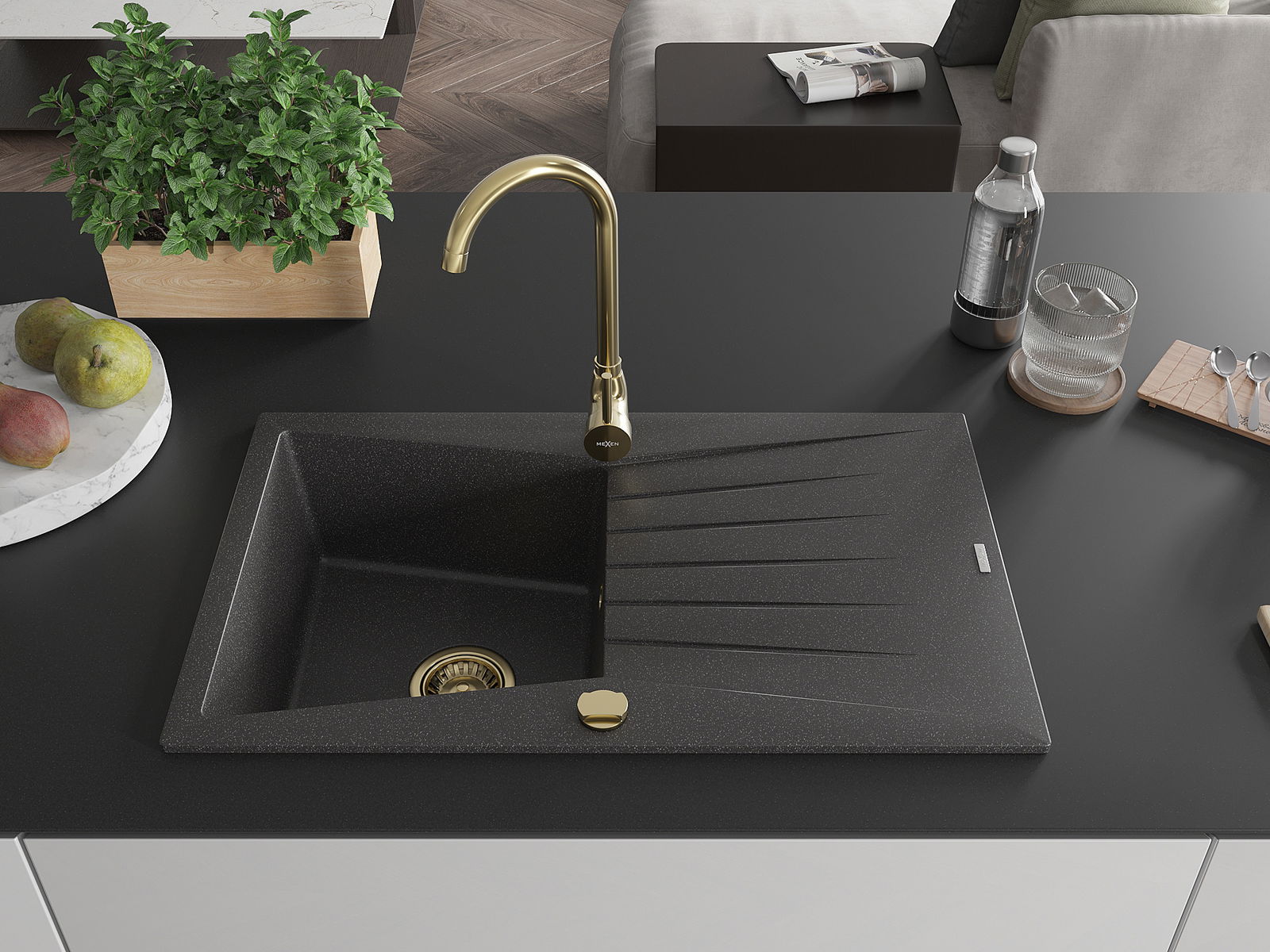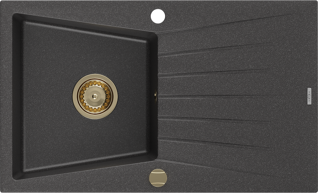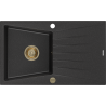 Mexen Cesar évier de cuisine en granit 1 bac avec égouttoir 775 x 470 mm, noir moucheté, siphon doré - 6514771010-76-G