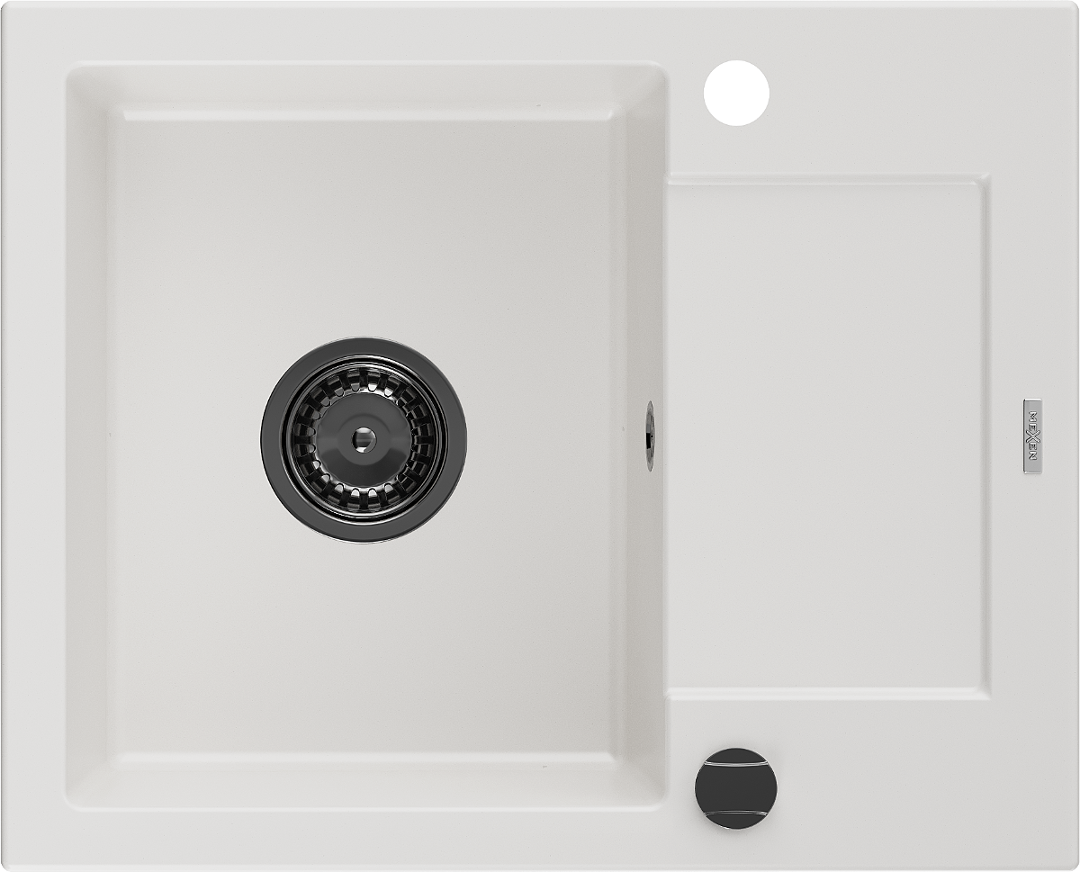 Mexen Enzo évier en granit 1 bac avec égouttoir 576 x 465 mm, blanc, siphon noir - 6506571005-20-B