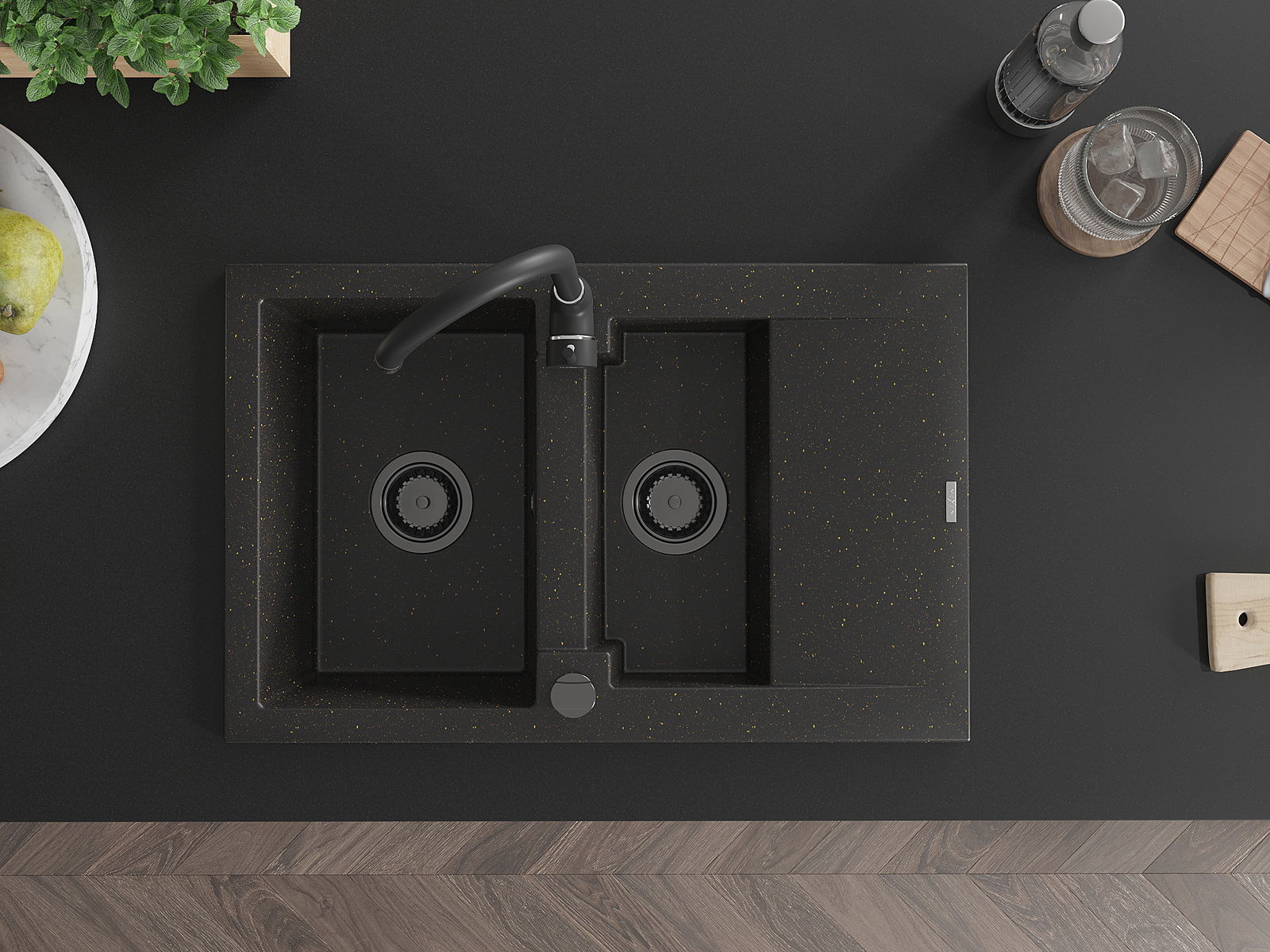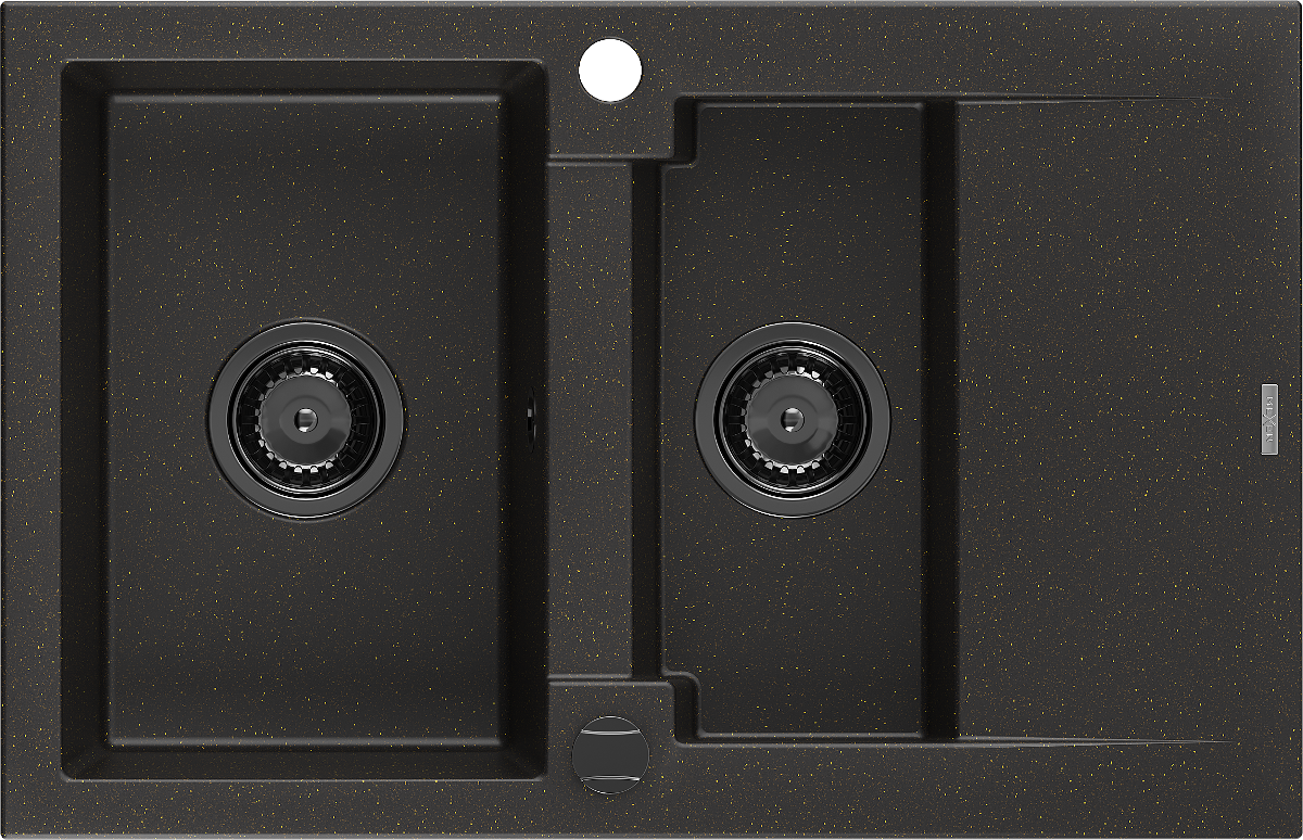 Mexen Gaspar évier en granit 1,5 bac avec égouttoir 737 x 475 mm, noir/doré métallisé, siphon noir - 6507731505-75-B