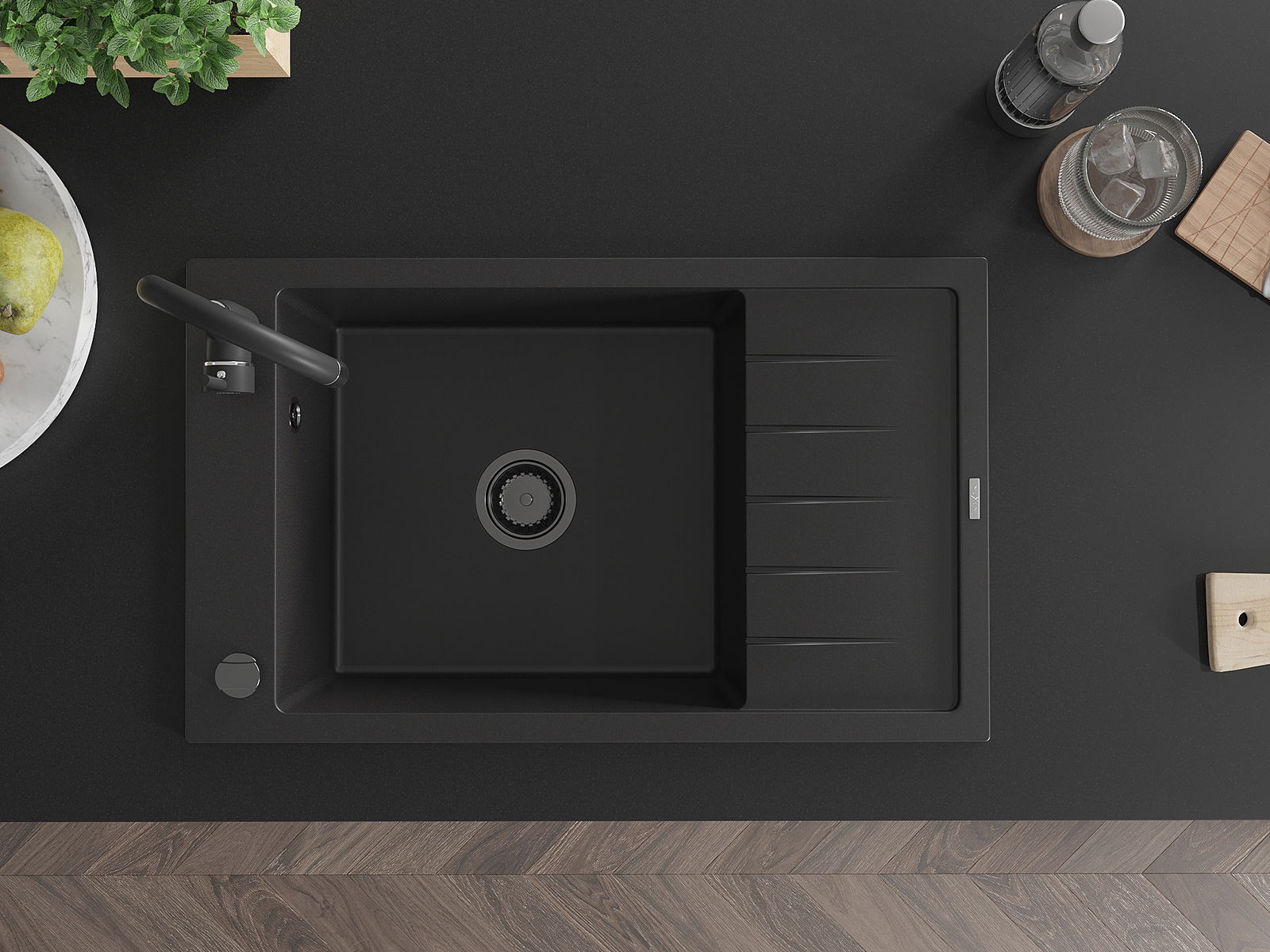 Mexen Elias évier en granit 1 bac avec égouttoir 795 x 480 mm, noir, siphon noir - 6511791005-77-B