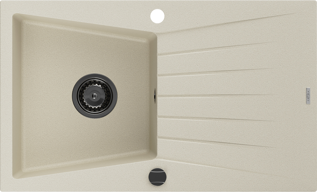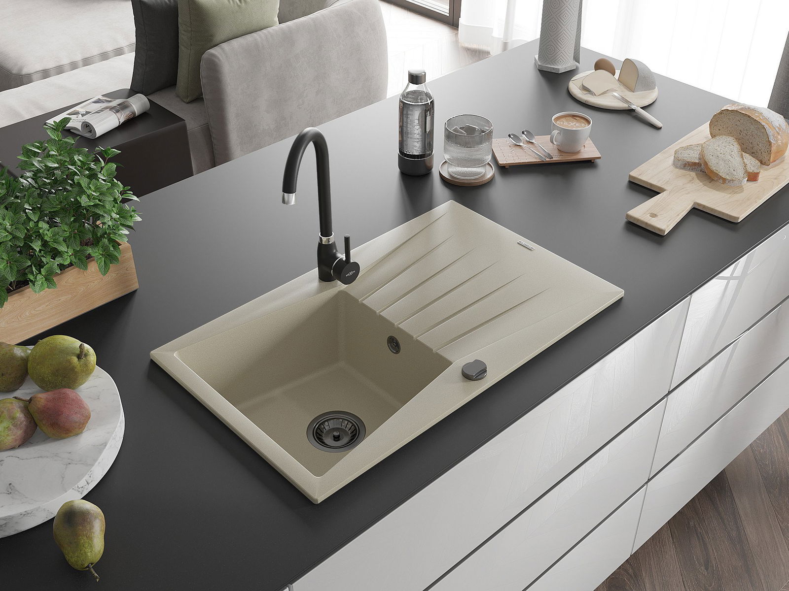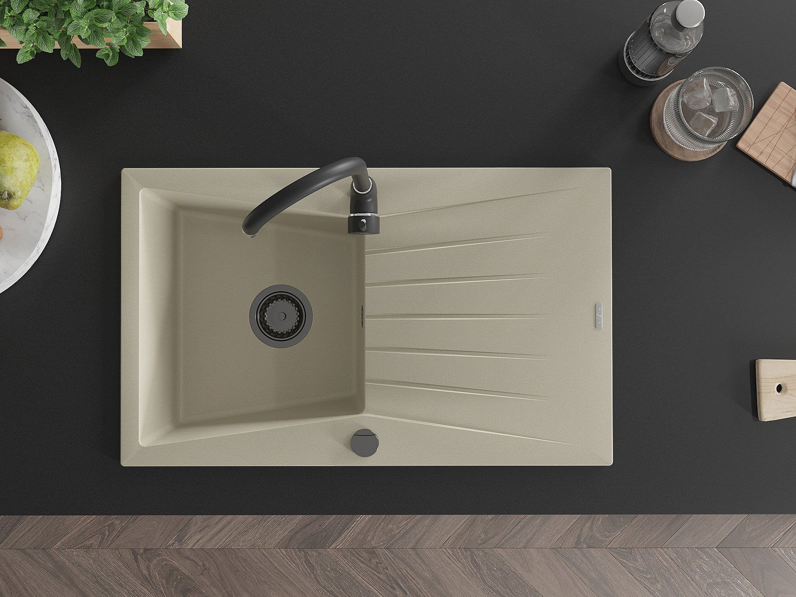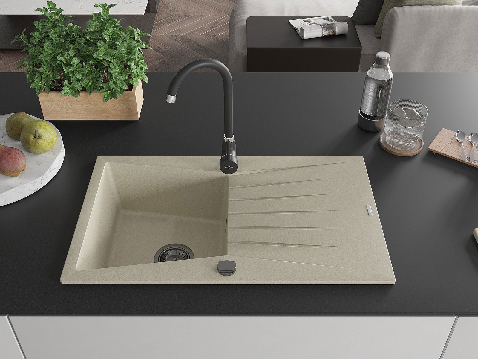 Mexen Cesar évier en granit 1 bac avec égouttoir 775 x 470 mm, beige, siphon noir - 6514771010-69-B