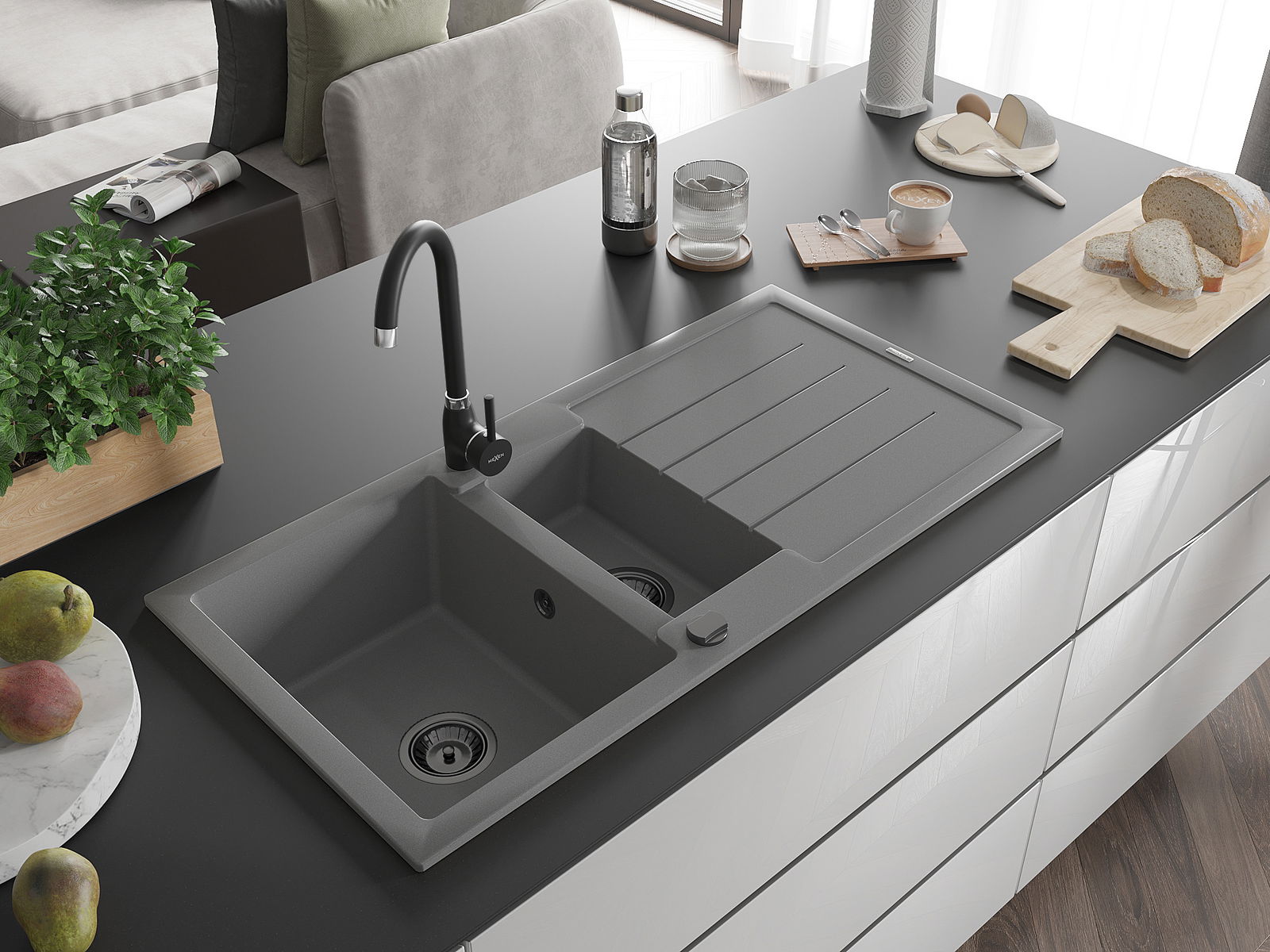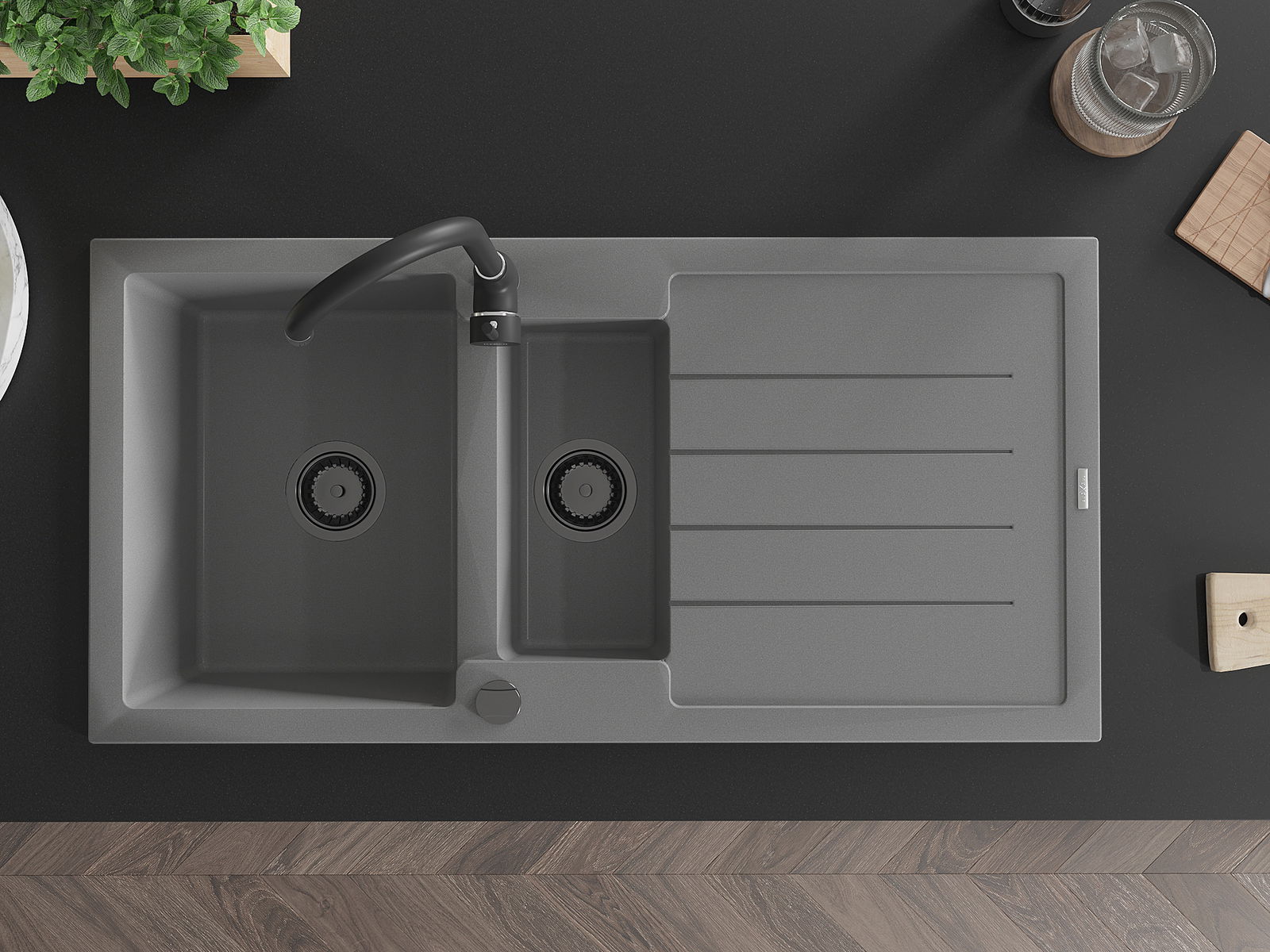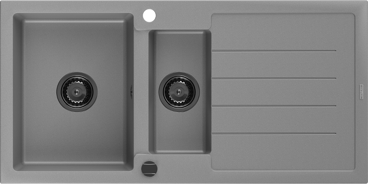 Mexen Andres évier en granit 1,5 bac avec égouttoir 1000 x 500 mm, gris, siphon noir - 6515101510-71-B