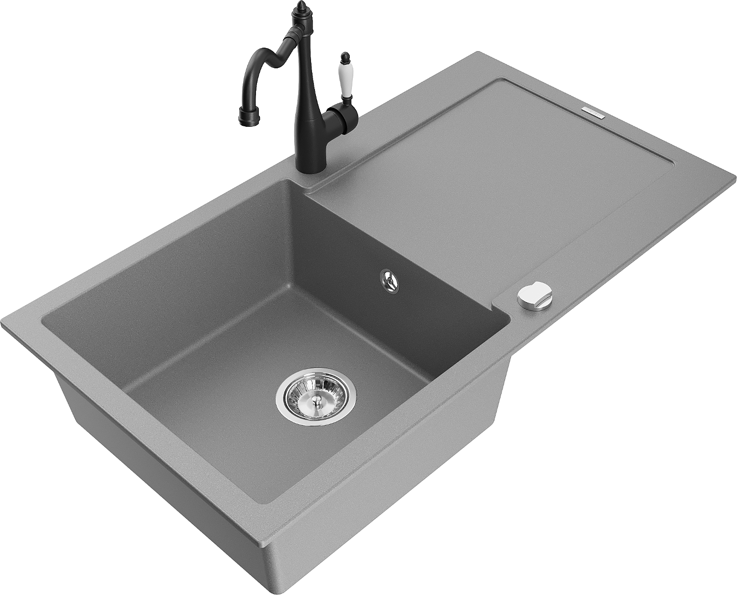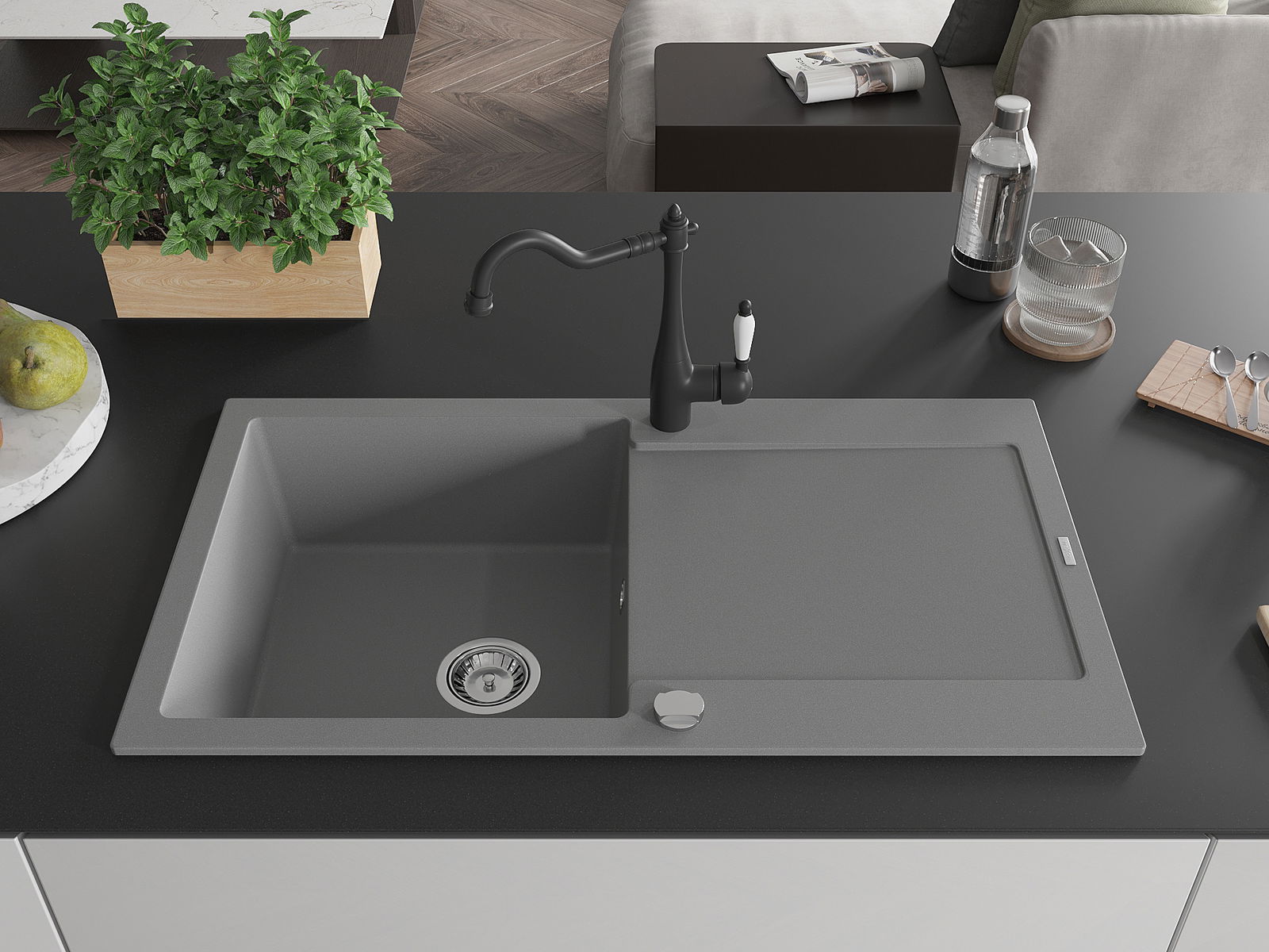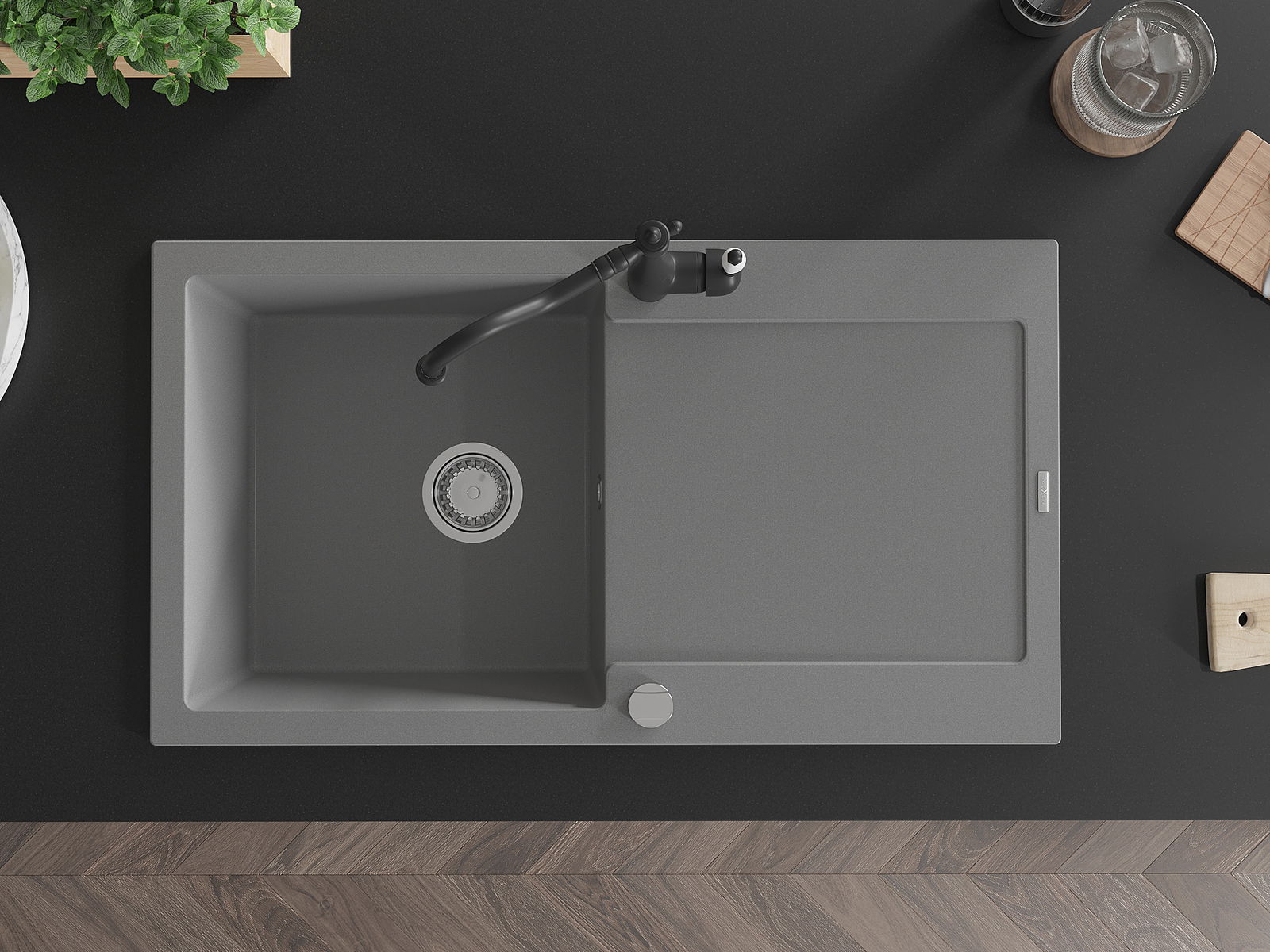 Mexen Leo évier en granit à 1 bac avec égouttoir et robinet de cuisine Carla, gris - 6501-71-670700-70