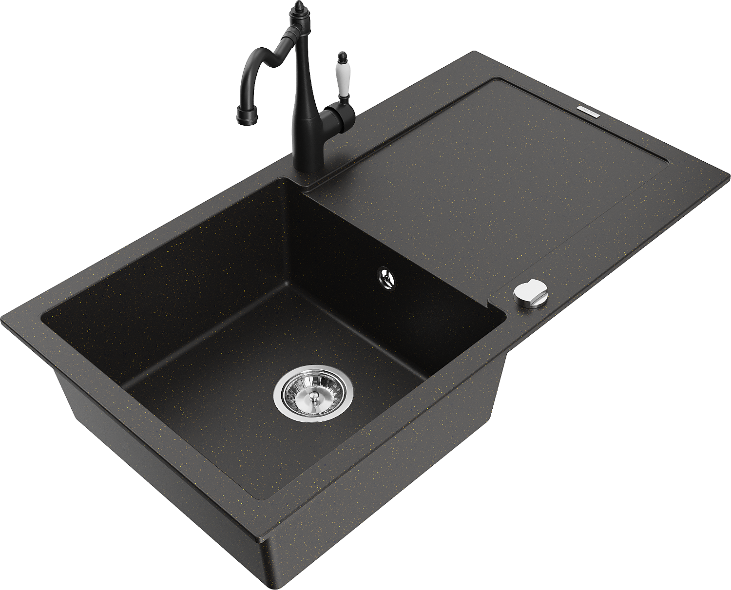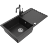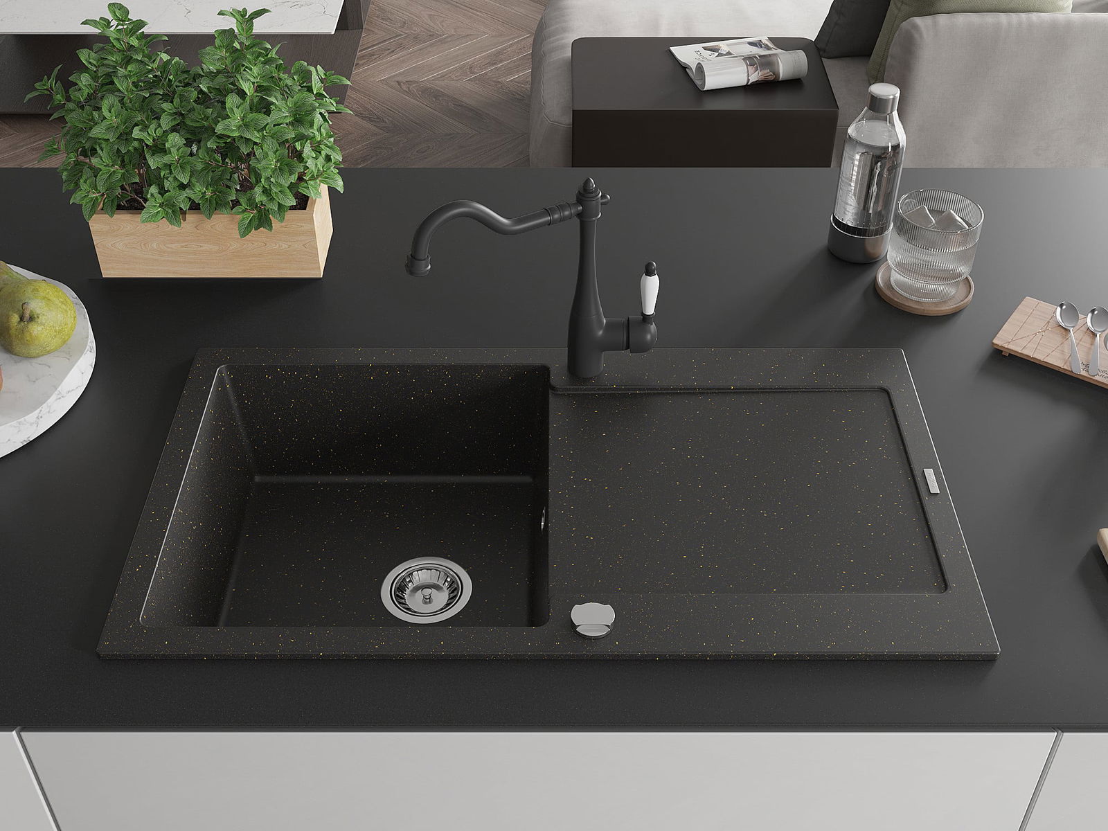 Mexen Leo évier granitique 1 bac avec égouttoir et mitigeur de cuisine Carla, noir/doré métallisé - 6501-75-670700-70