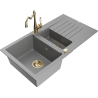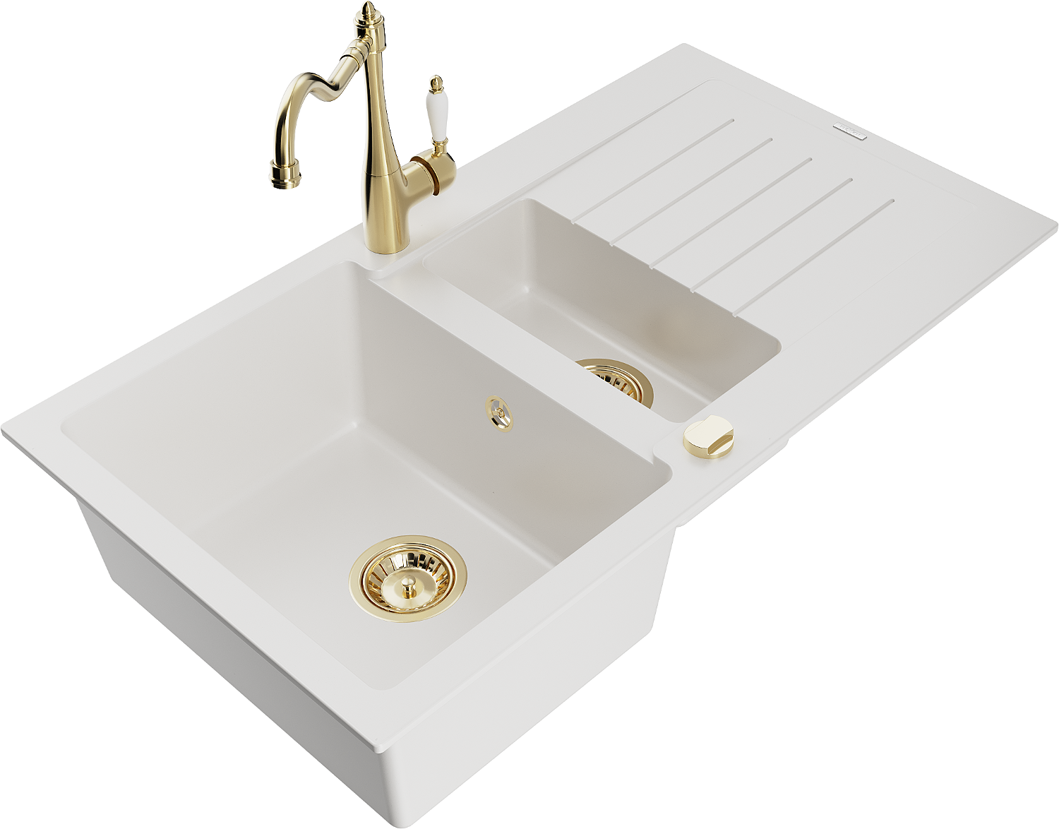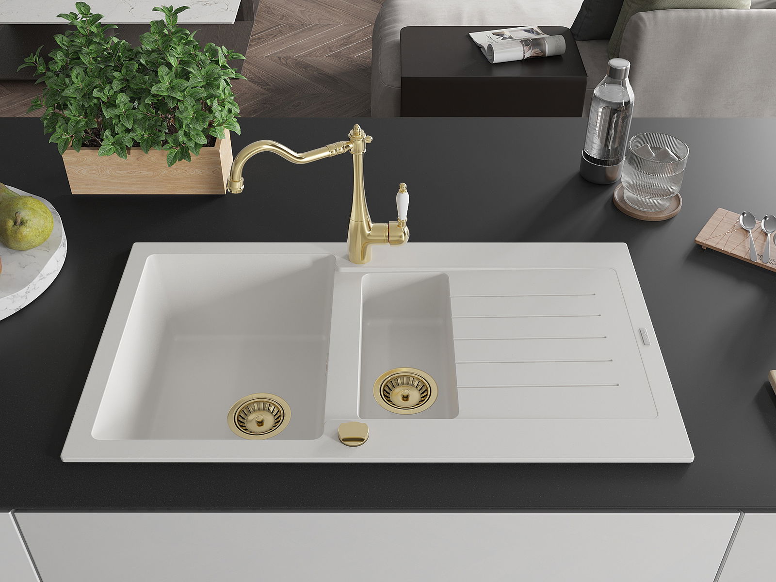 Mexen Matias évier en granit 1,5 bac avec égouttoir et robinet de cuisine Carla, blanc - 6502-20-670700-50