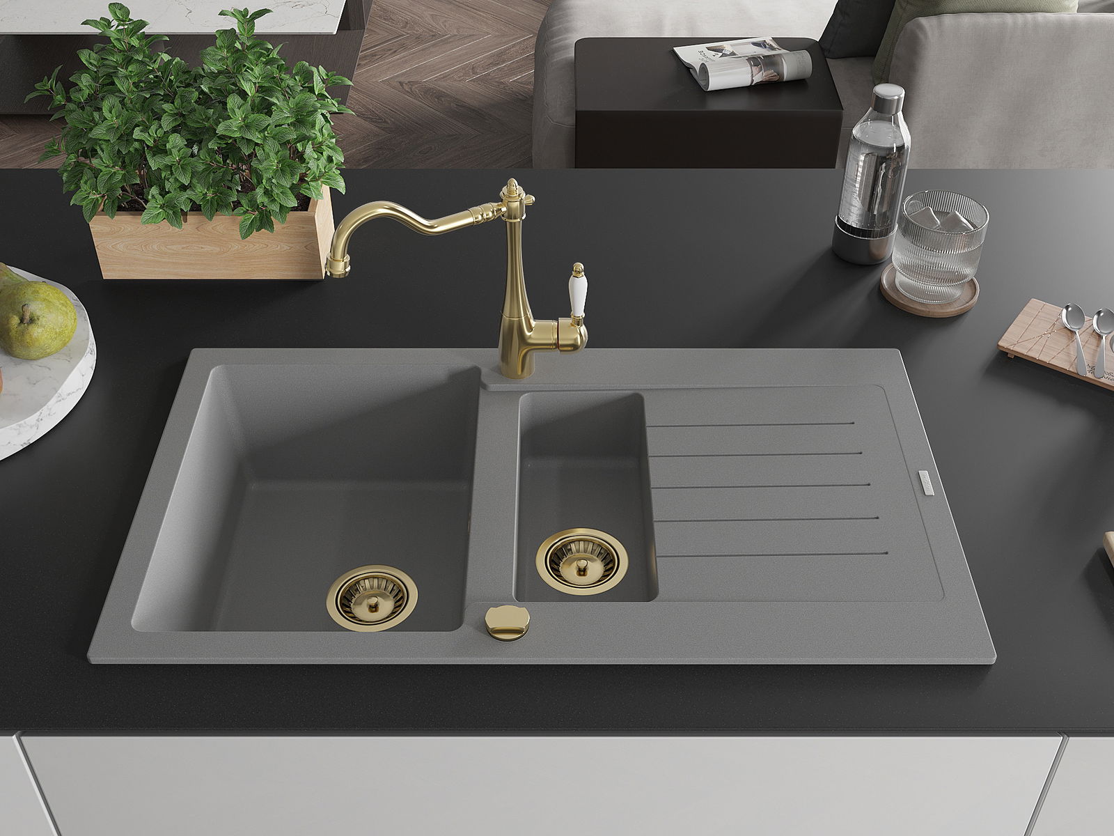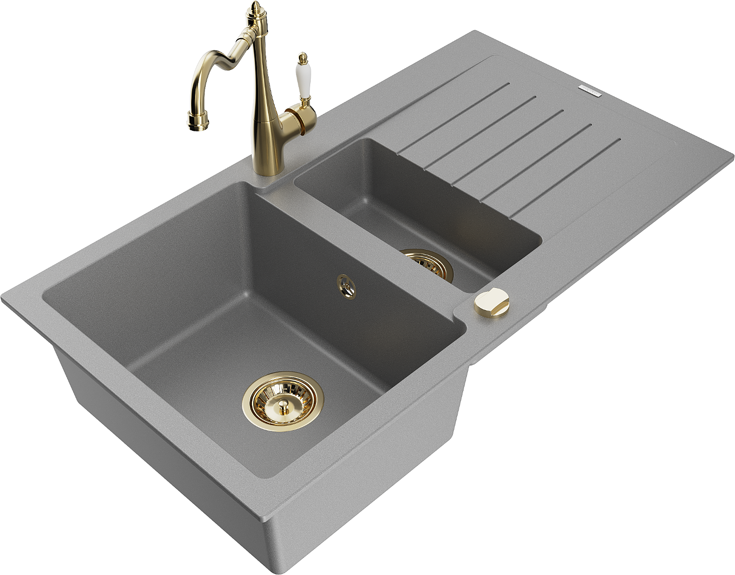 Mexen Matias évier en granit 1,5 bac avec égouttoir et robinet de cuisine Carla, gris - 6502-71-670700-50