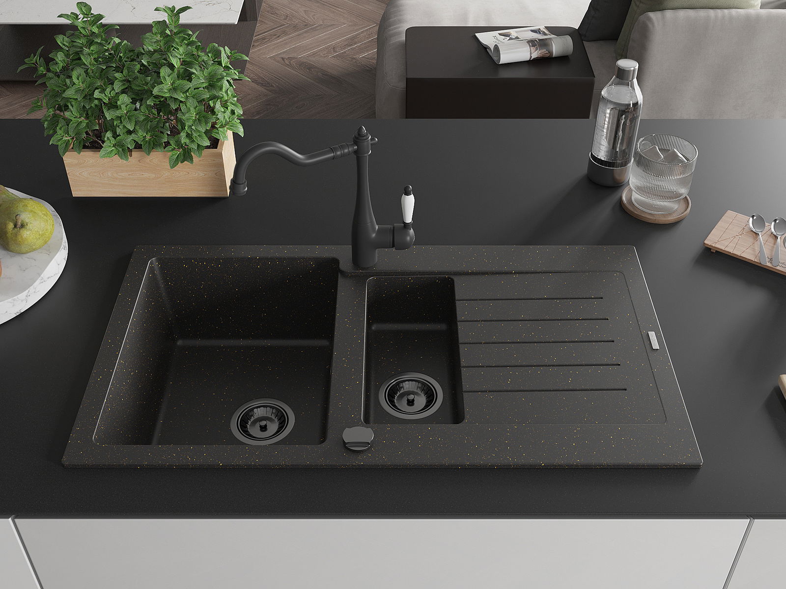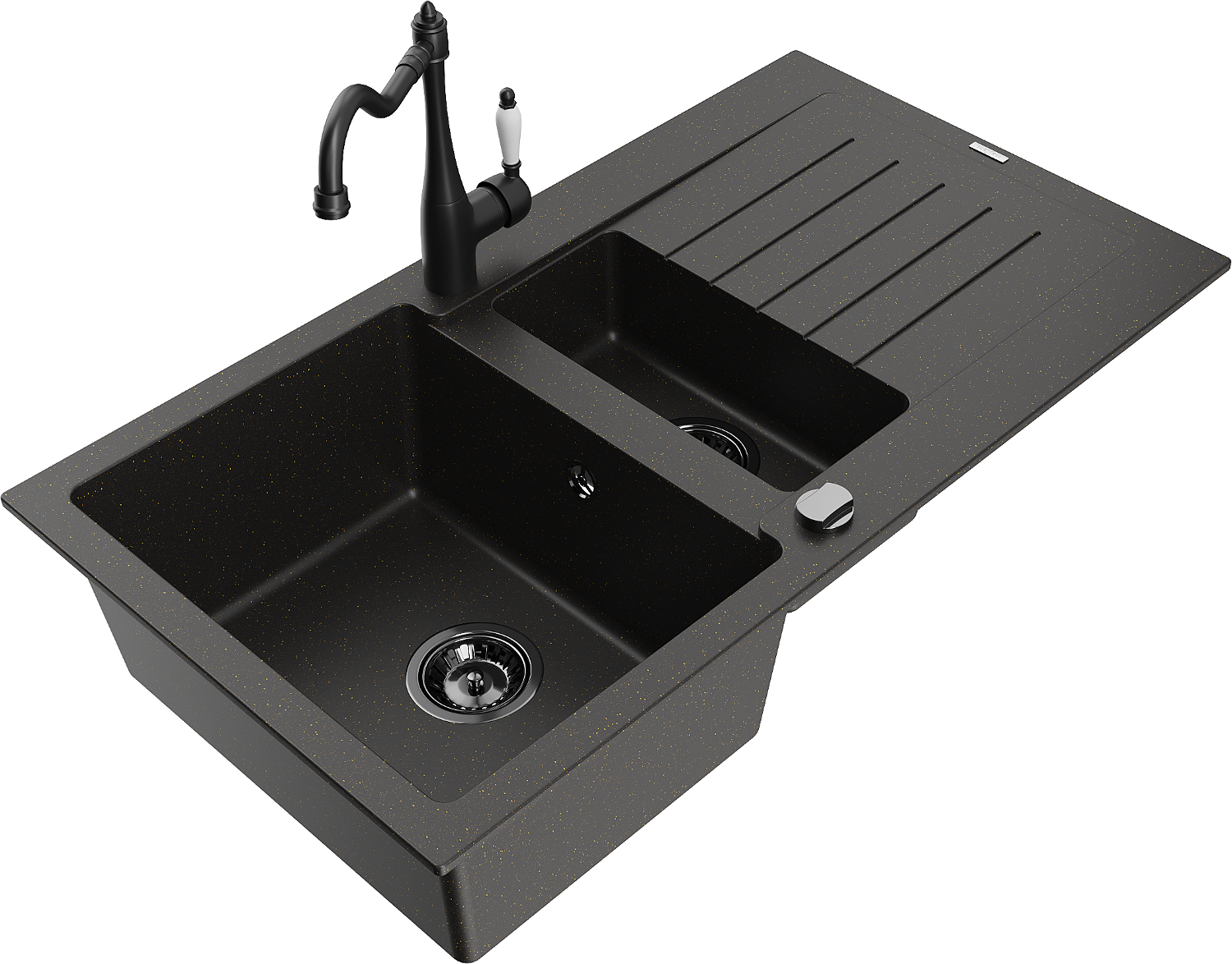 Mexen Matias évier en granit 1,5 bac avec égouttoir et robinet de cuisine Carla noir/or métallique - 6502-75-670700-70-B