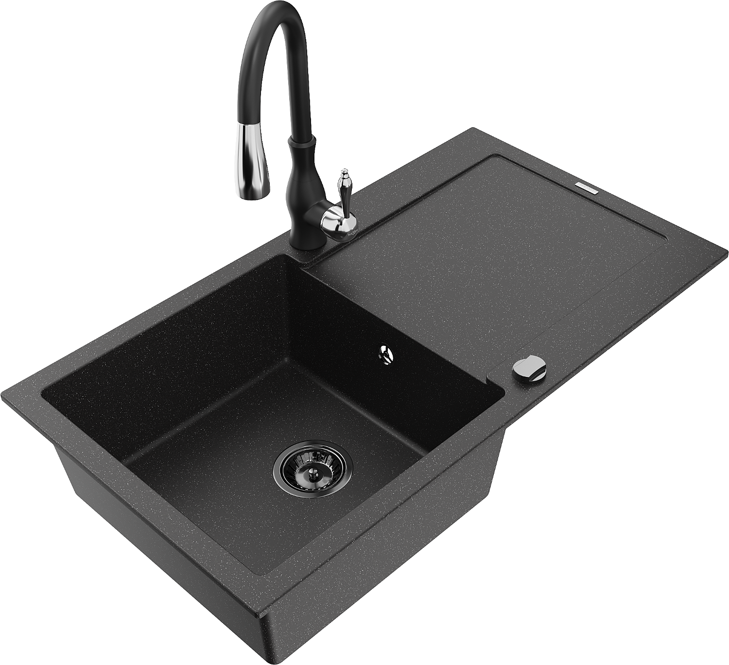 Mexen Leo évier en granit 1 bac avec égouttoir et robinet de cuisine Savita, noir/métal argenté - 6501-73-672601-70-B