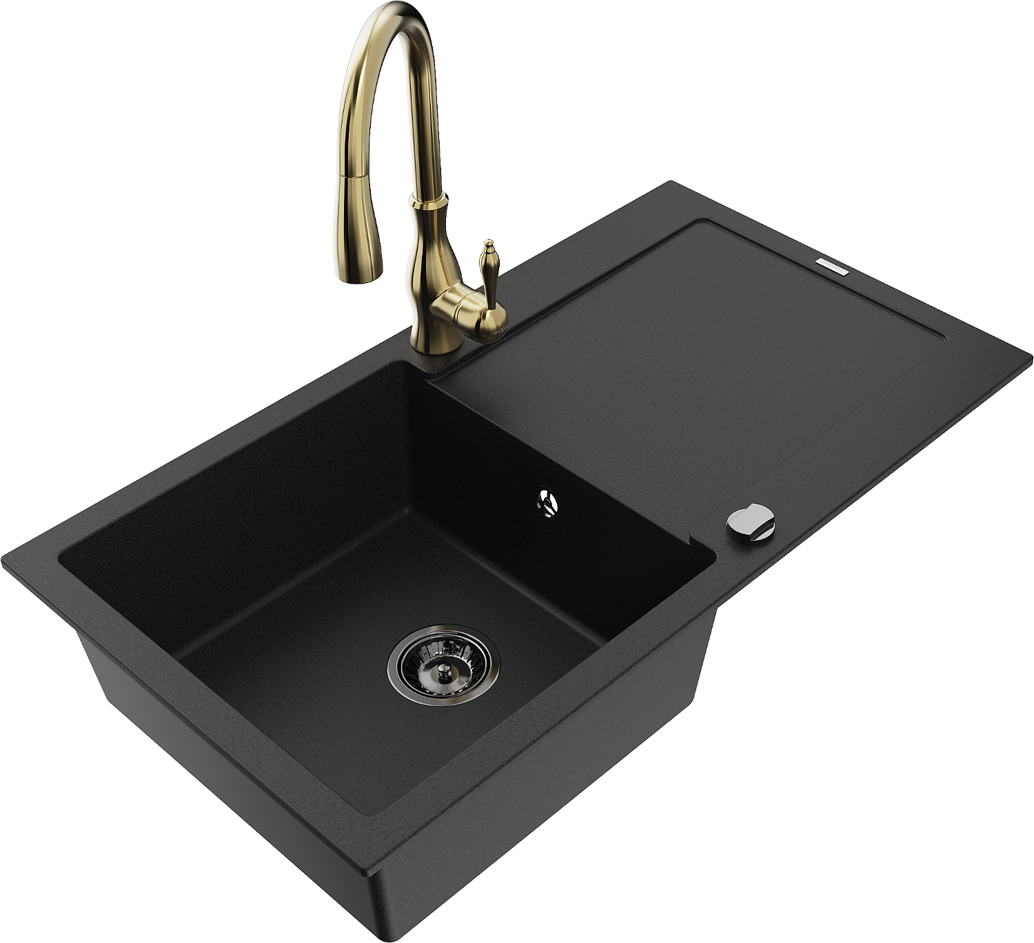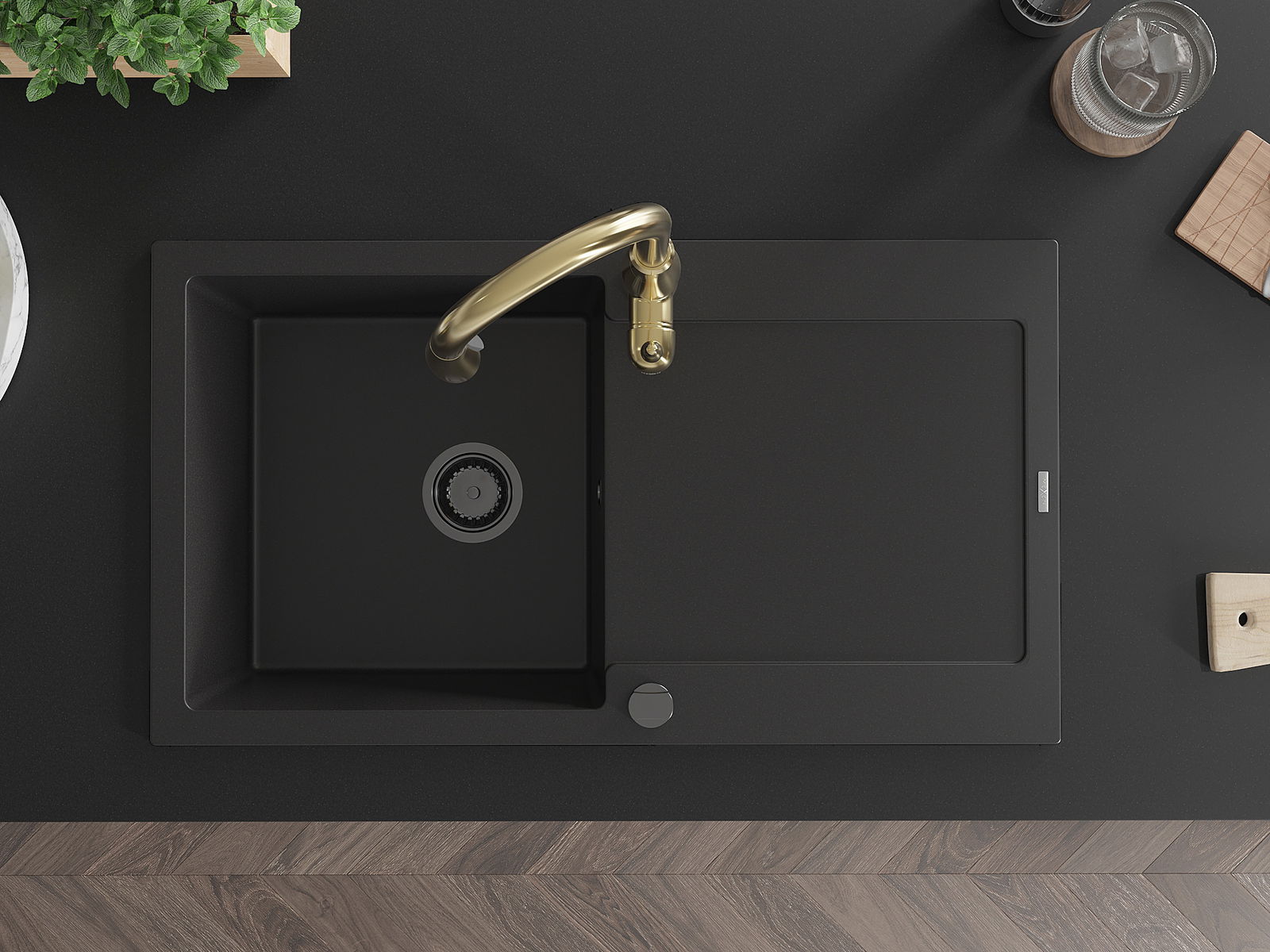 Mexen Leo évier en granit à 1 bac avec égouttoir et robinet de cuisine Savita, noir - 6501-77-672601-50-B