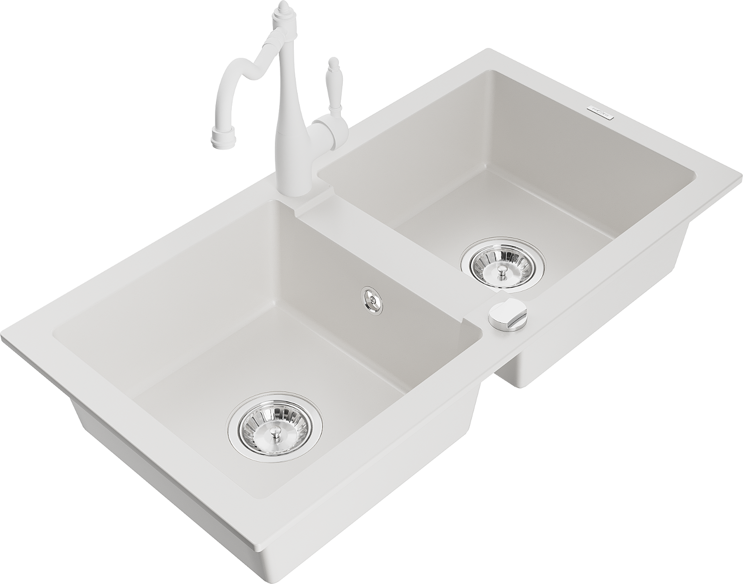Mexen Mario évier en granit à 2 bacs avec robinet de cuisine Carla, blanc - 6504-20-670700-20