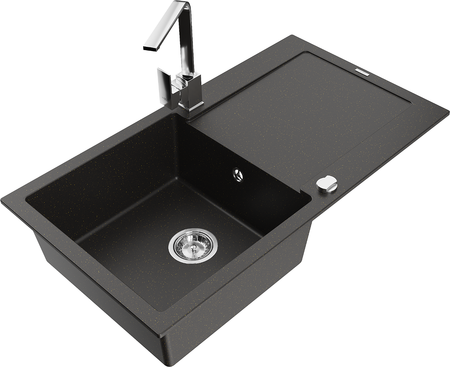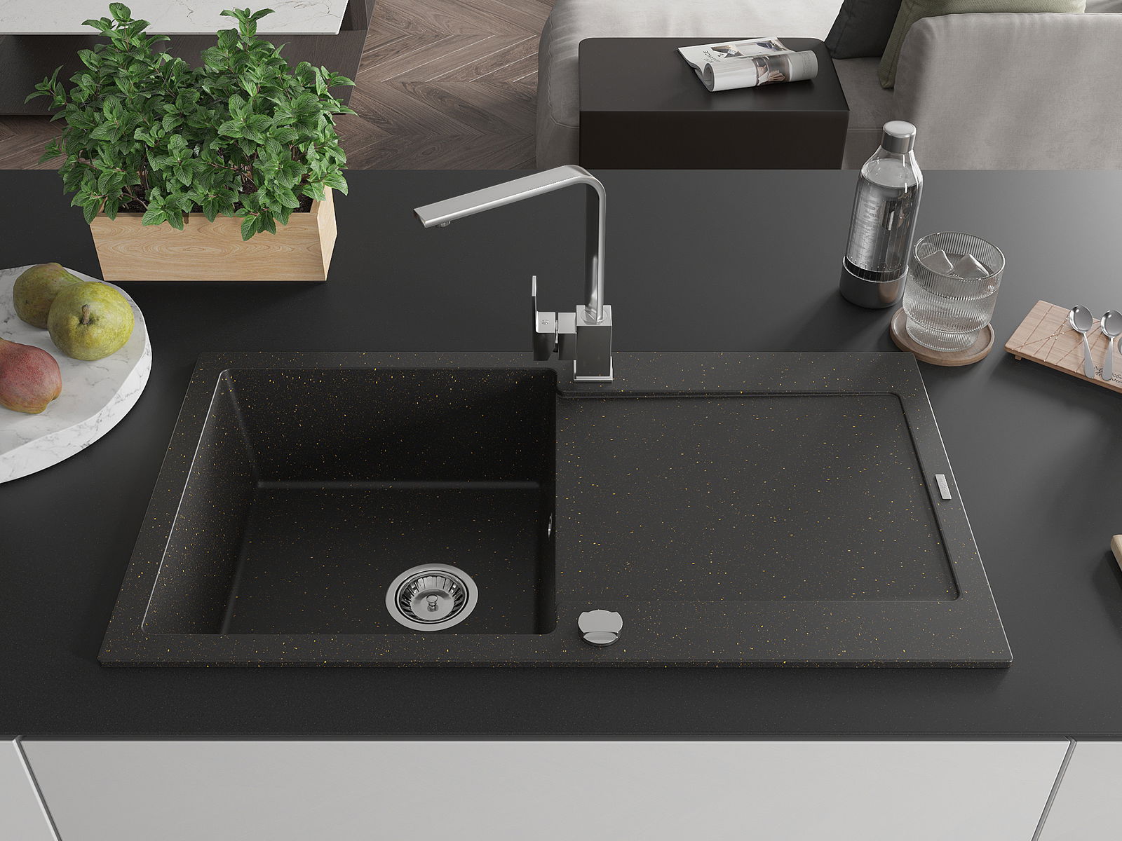 Mexen Leo évier en granit 1 bac avec égouttoir et mitigeur de cuisine Rita, noir/doré métallisé - 6501-75-670300-00