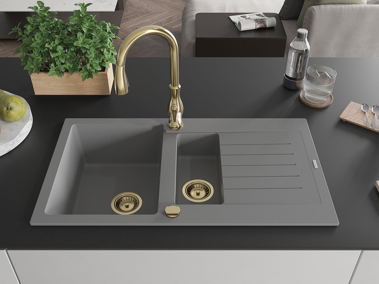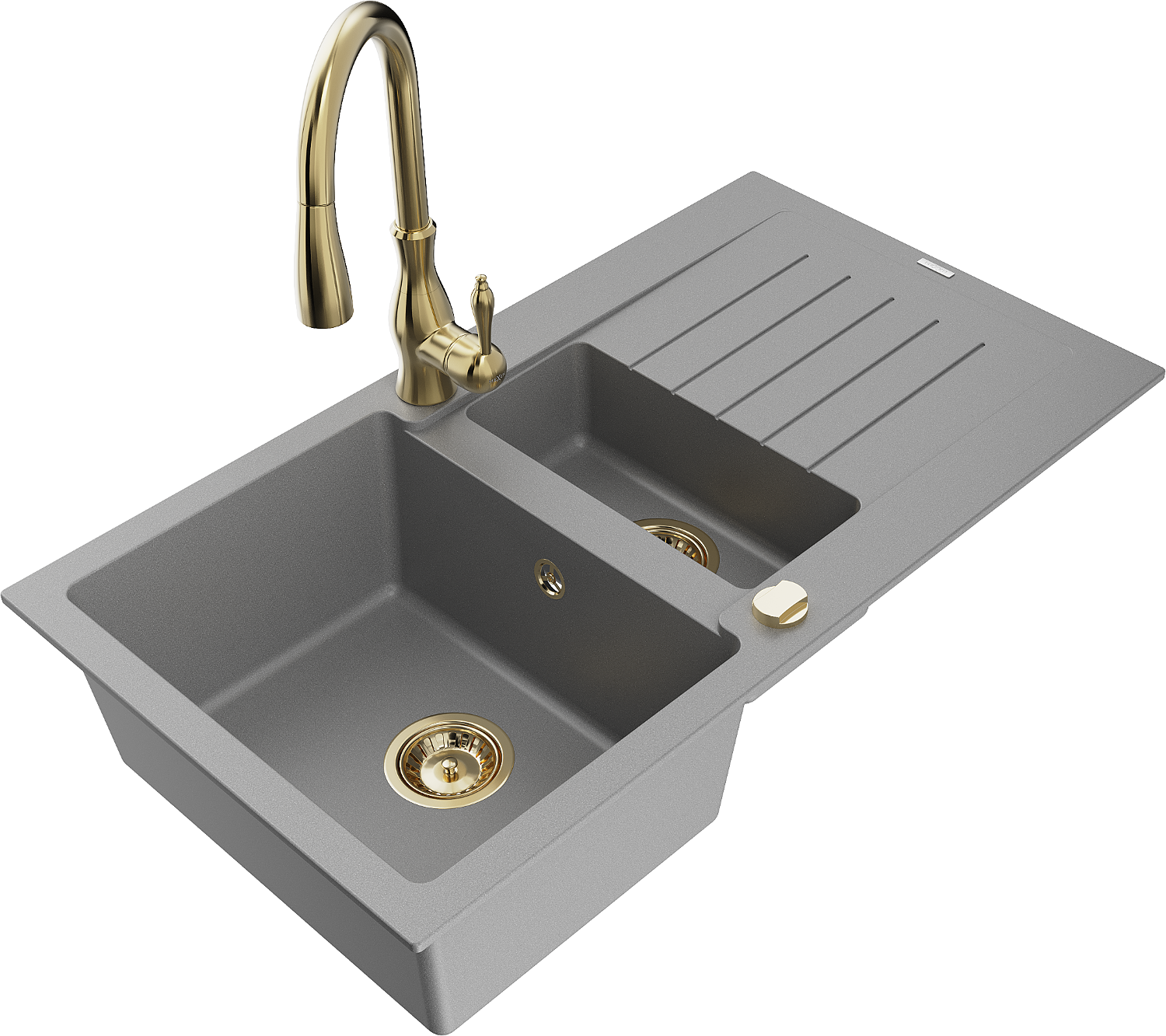 Mexen Matias évier en granit 1,5 bac avec égouttoir et robinet de cuisine Savita, gris - 6502-71-672601-50