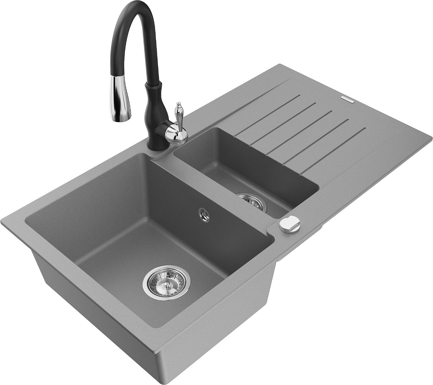 Mexen Matias évier en granit 1,5 bac avec égouttoir et robinet de cuisine Savita, gris - 6502-71-672601-70