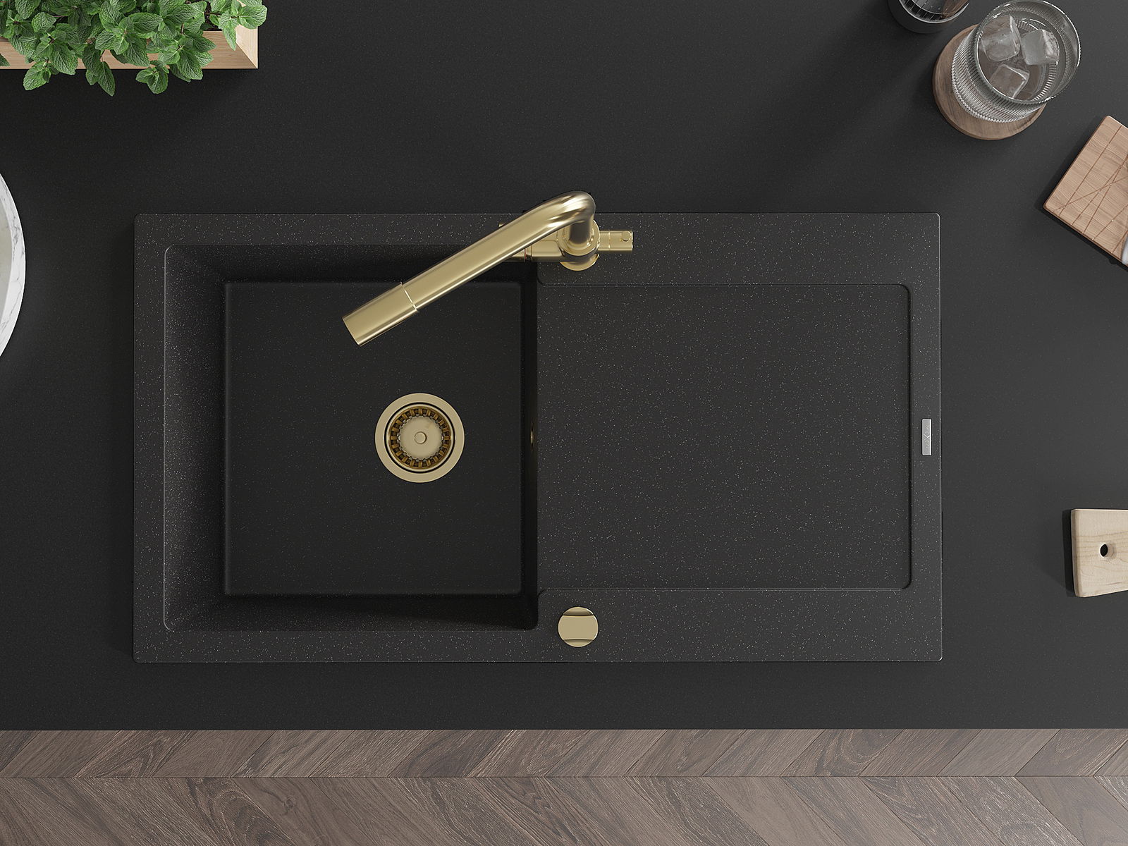 Mexen Leo évier en granit 1 bac avec égouttoir et robinet de cuisine Duero, noir/argent métallique - 6501-73-671600-50