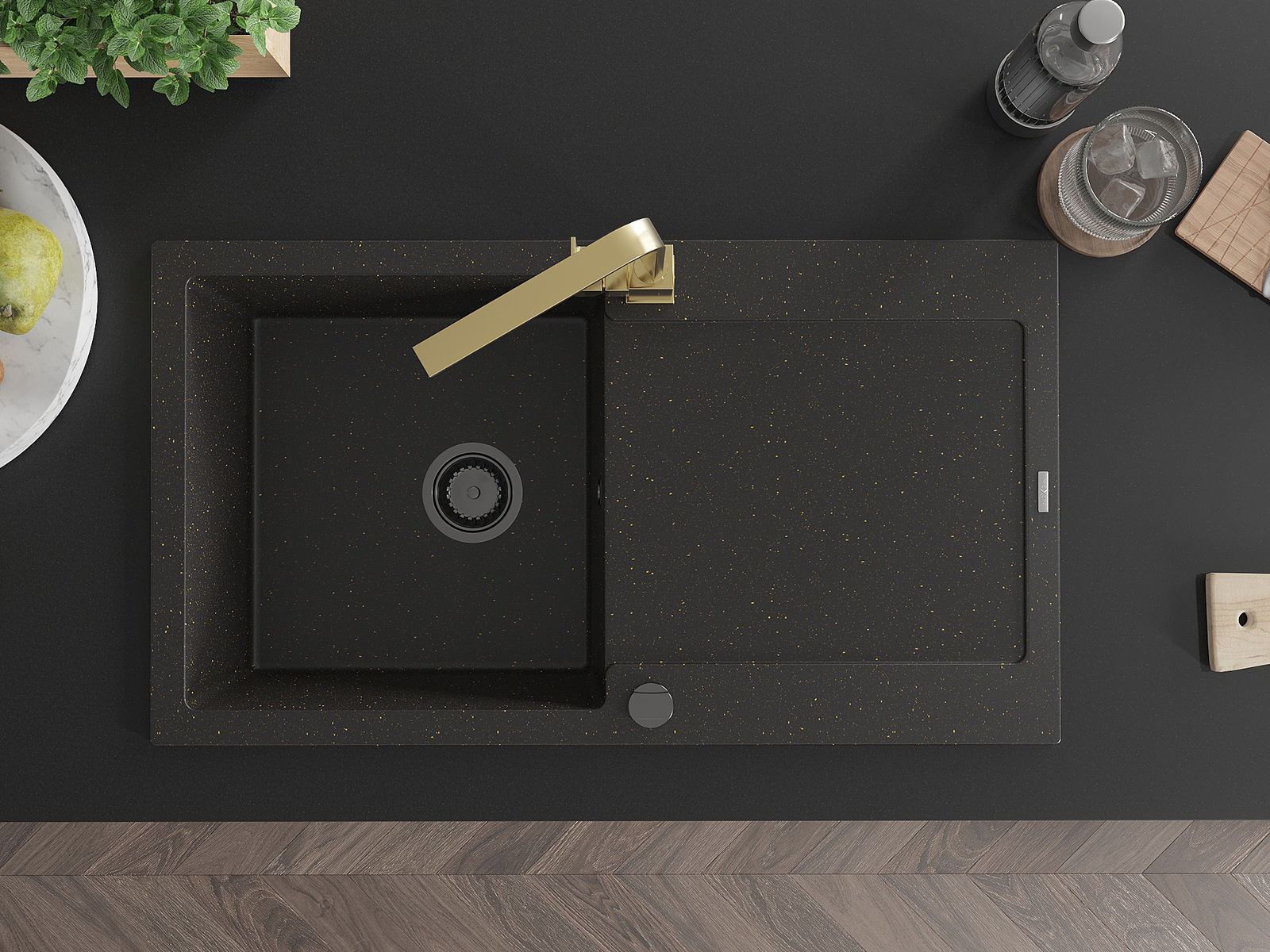 Mexen Leo évier en granit 1 bac avec égouttoir et robinet de cuisine Rita, noir/or métallisé - 6501-75-670300-50-B