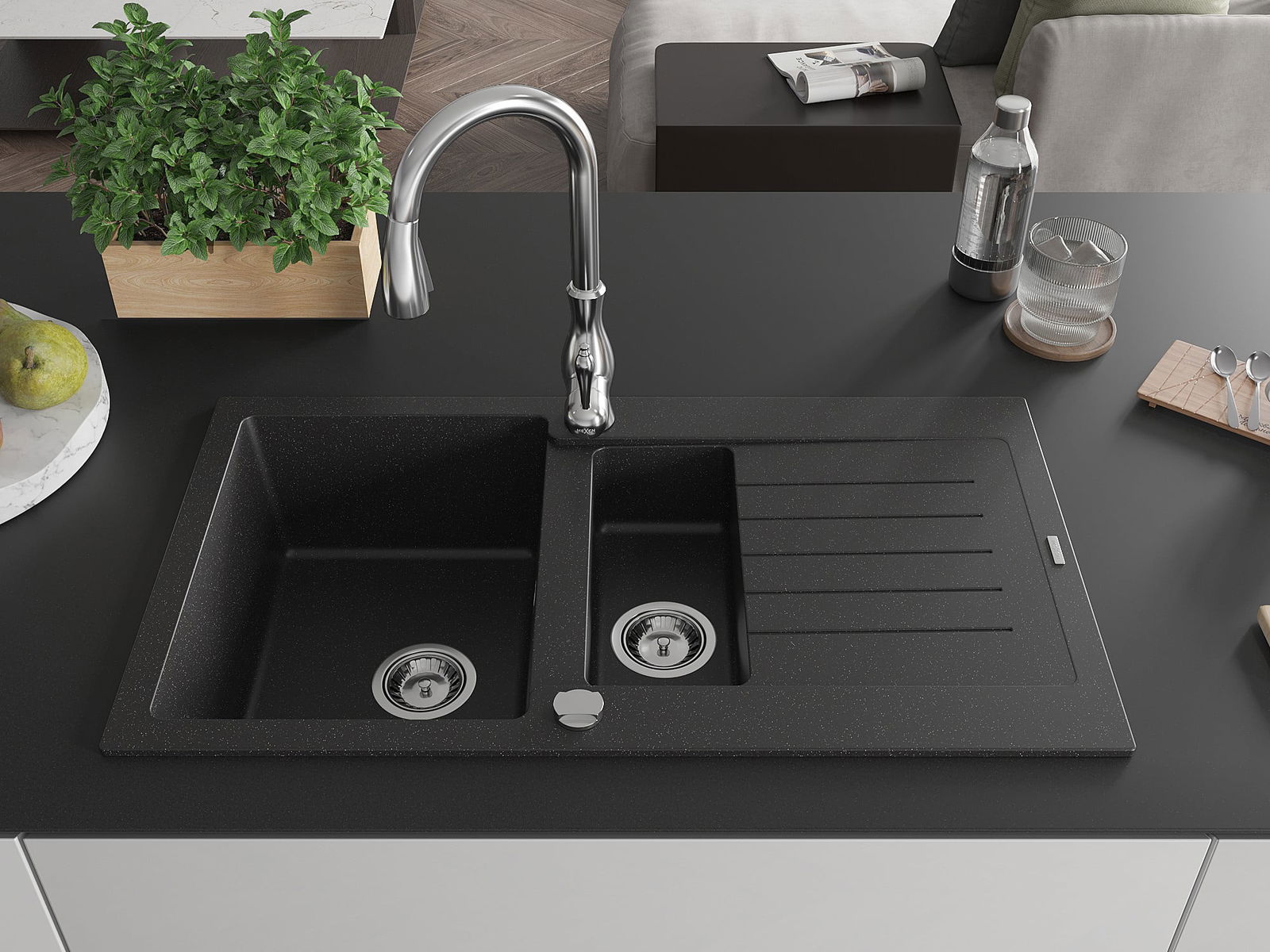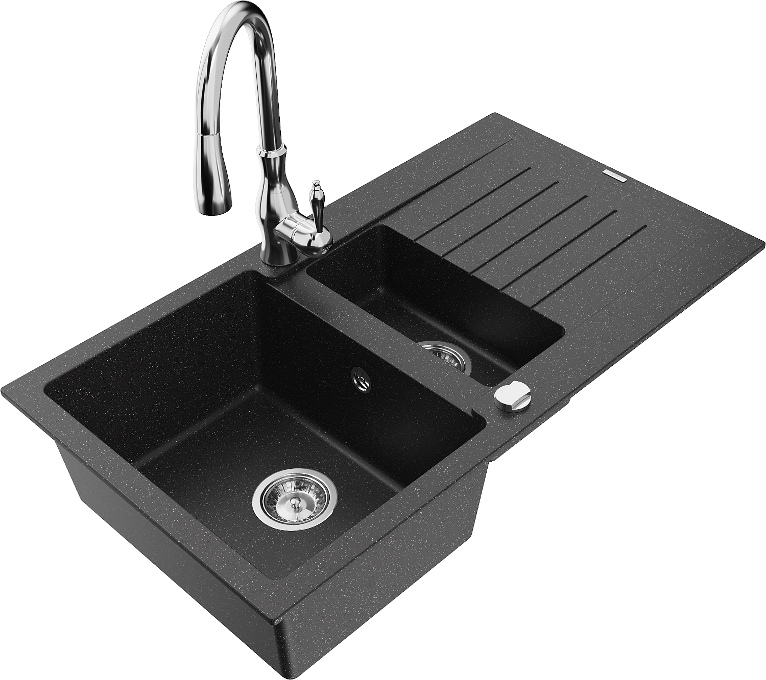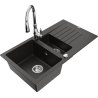 Mexen Matias évier en granit 1,5 bac avec égouttoir et robinet de cuisine Savita, noir/argent - 6502-73-672601-00