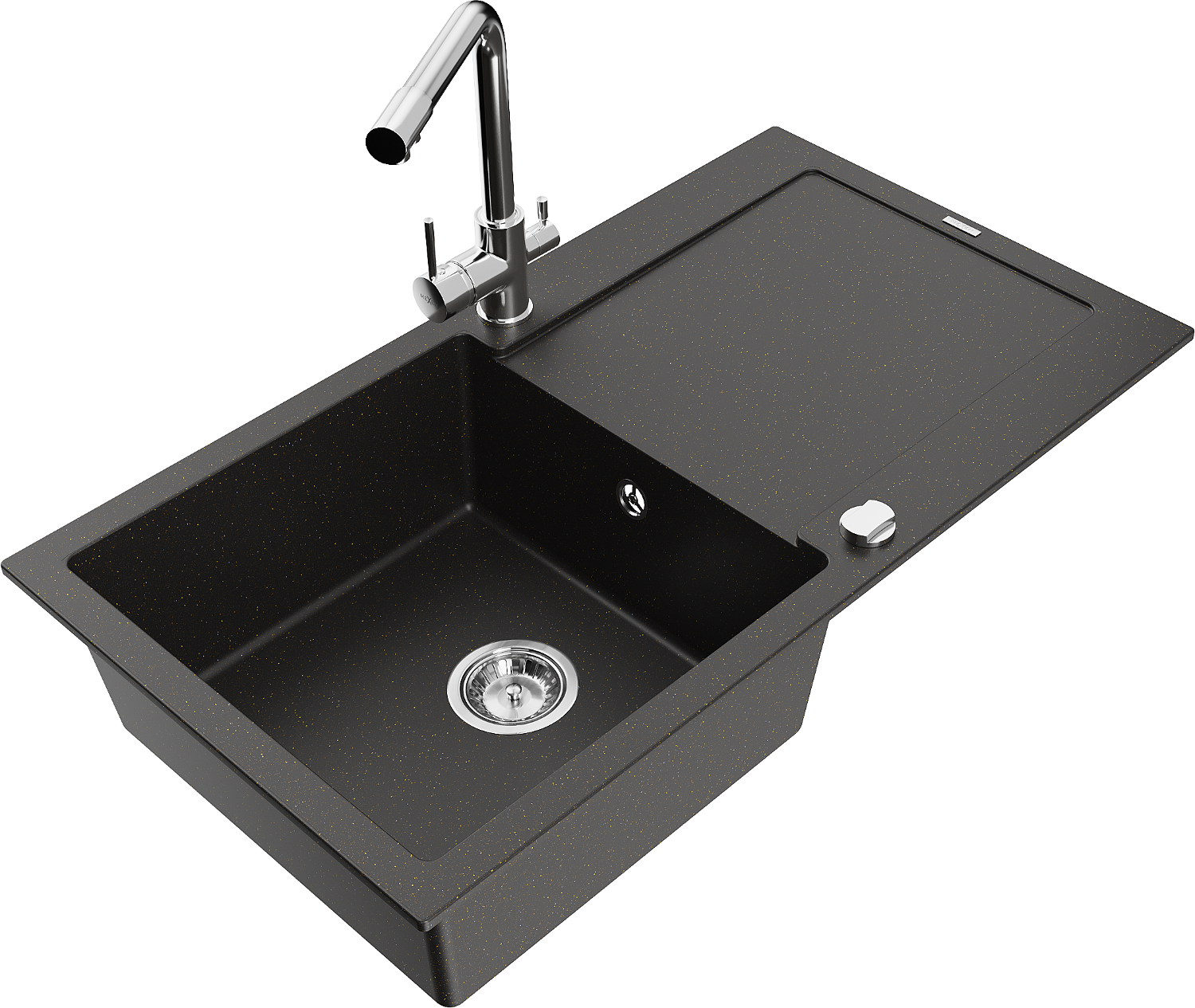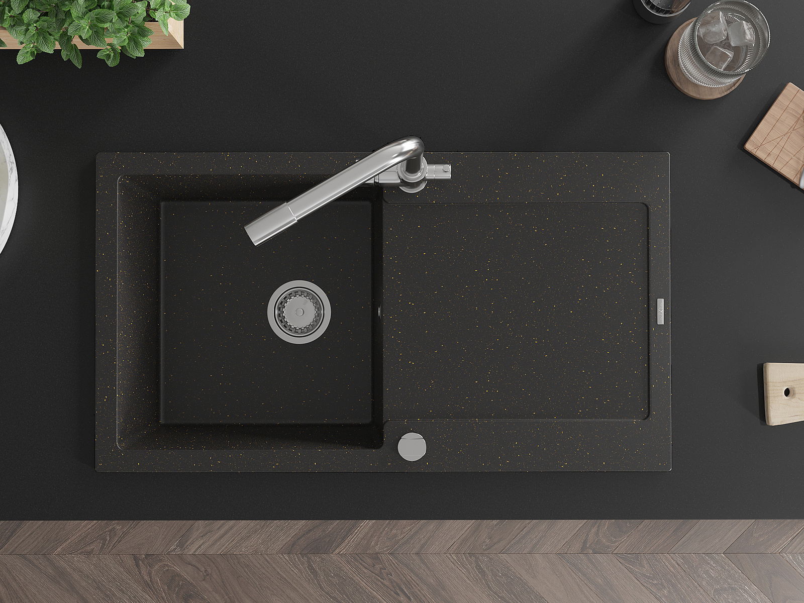 Mexen Leo évier en granit à 1 bac avec égouttoir et robinet de cuisine Duero, noir/or métallique - 6501-75-671600-00