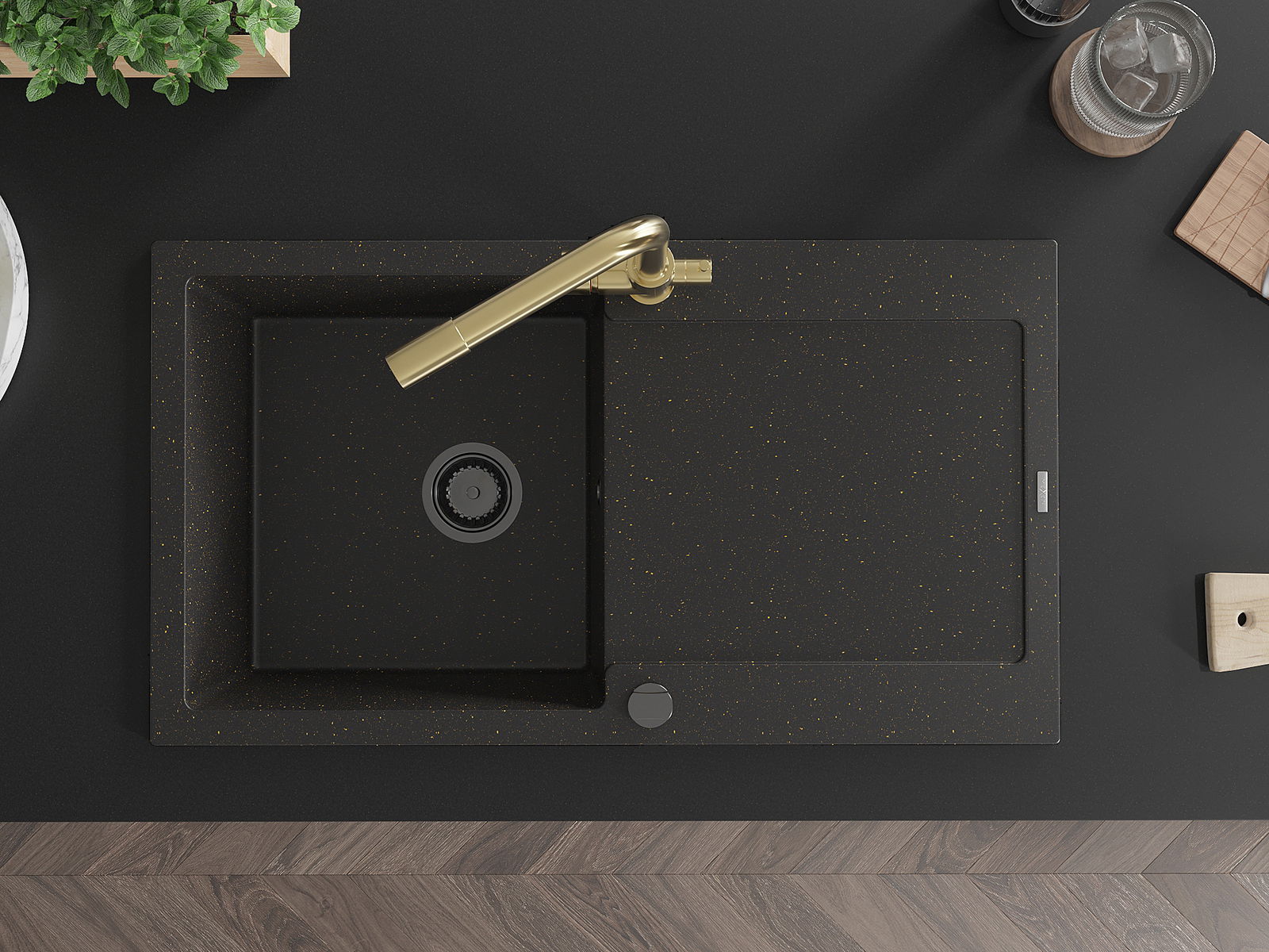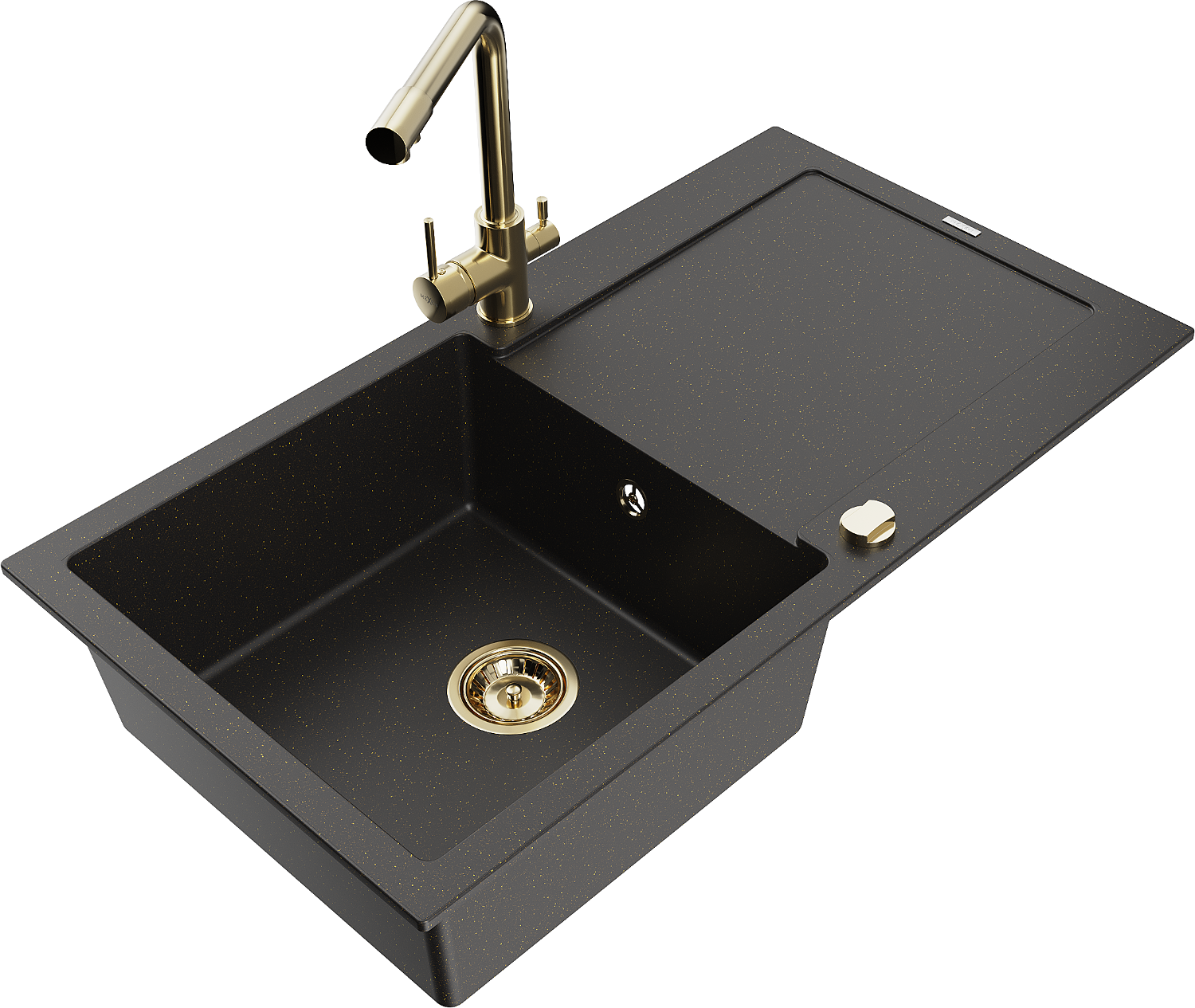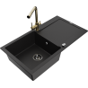Mexen Leo évier en granit 1 bac avec égouttoir et robinet de cuisine Duero, noir/or métallique - 6501-75-671600-50-B