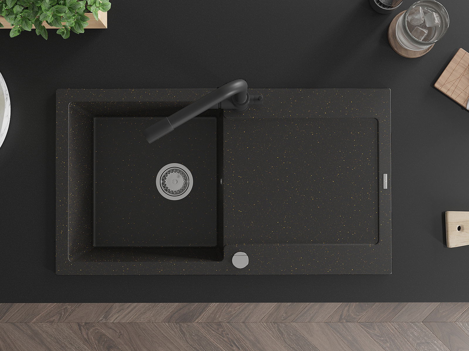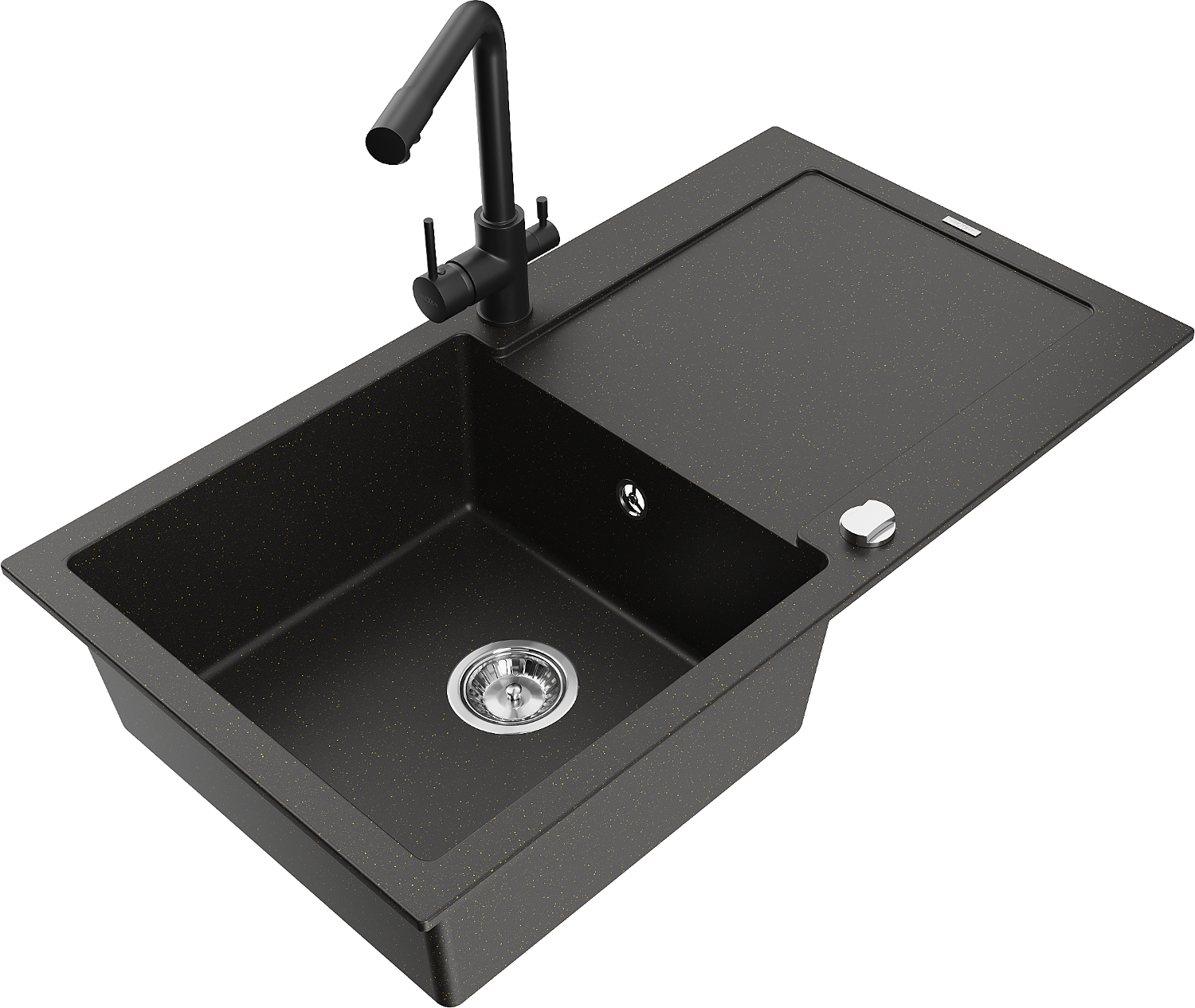 Mexen Leo évier en granit 1 bac avec égouttoir et robinet de cuisine Duero, noir/or métallique - 6501-75-671600-70